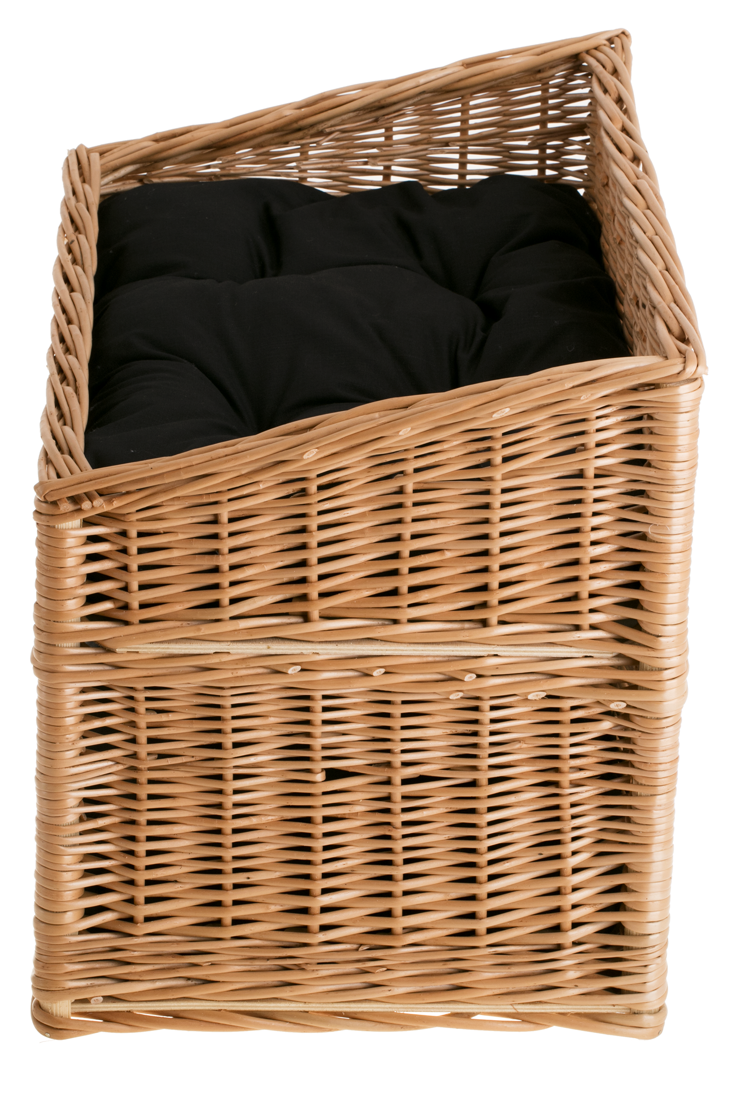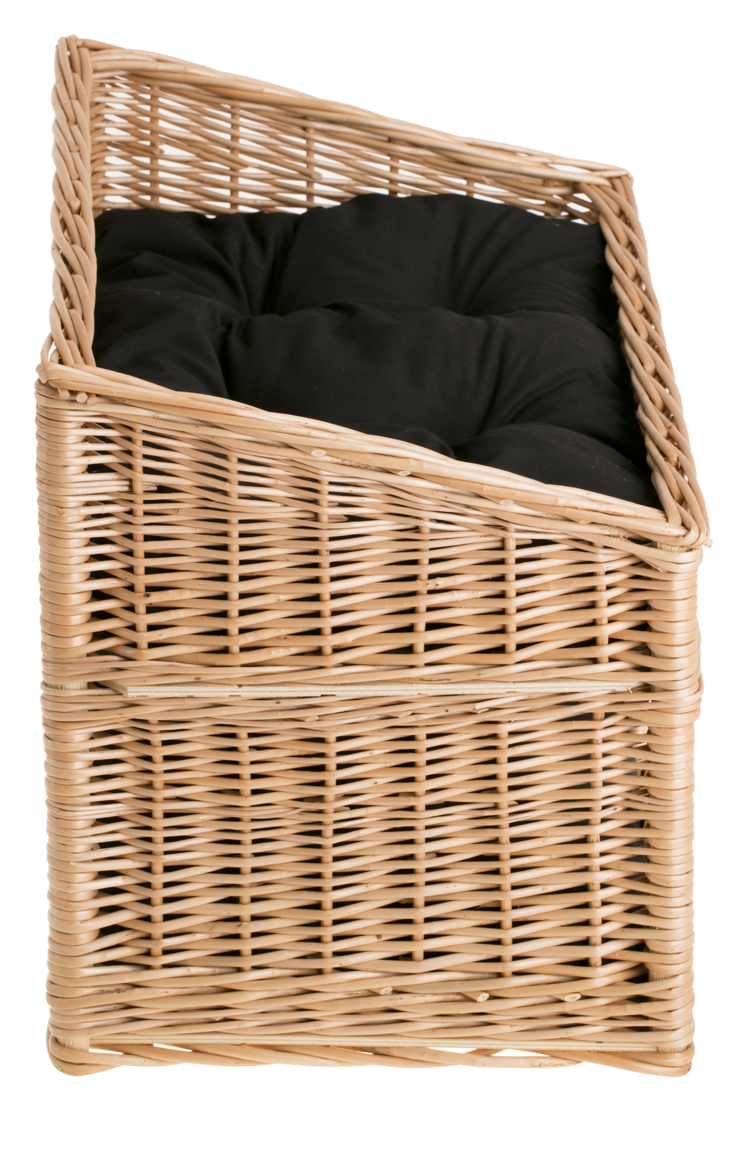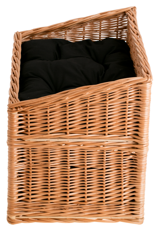 Dolní patro vytváří útulné lehátko, kam se kočka může schovat a v klidu odpočívat; okénko zajišťuje přísun světla a přehled o dění v domácnosti. Horní patro funguje jako terasa pro pozorování, ideální na ranní zdřímnutí nebo odpolední lenošení. Proutěný koš stojí pevně na podlaze a měkké polštářky zvyšují komfort i pro nejnáročnější kočičí miláčky.