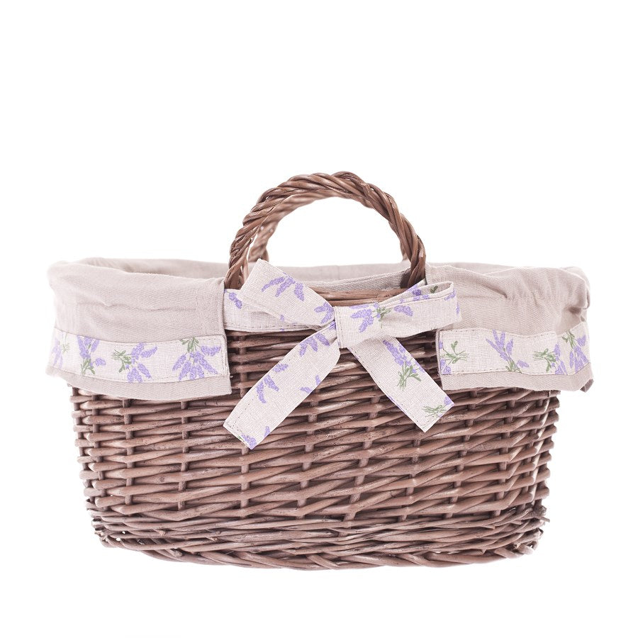 Der runde Korb aus braunem Weidengeflecht besticht durch sorgfältiges, gleichmäßiges Flechtwerk und einen dezenten halbmatten Glanz. Zwei stabile, gedrehte Griffe erleichtern das Tragen, und der obere Rand ist glatt verarbeitet für mehr Komfort. Im Inneren befindet sich ein beiger Innensack aus weichem Stoff, der mit Schleifen an den Griffen befestigt ist, sodass er an den Seiten sicher sitzt. Eine zarte dekorative Einfassung mit Pflanzenmotiv unterstreicht den natürlichen Charakter, und der ebene Boden sorgt für Standfestigkeit.