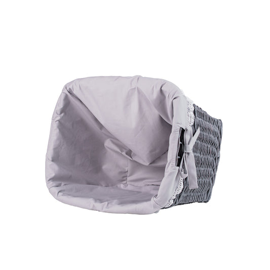 Der Korb ist handgeflochten aus europäischer Weide – einem erneuerbaren und biologisch abbaubaren Rohstoff. Die Oberfläche wurde in einem modischen Grauton mit sicheren, zertifizierten Farben behandelt. Die handwerkliche Flechttechnik sorgt für Langlebigkeit, Formstabilität und sorgfältig verarbeitete Kanten. Das Innere ist mit einem Futter aus natürlicher Baumwolle versehen, das mit dekorativer Spitze und gebundenen Schleifen verziert ist und das gepflegte, ästhetische Erscheinungsbild des Korbs unterstreicht.