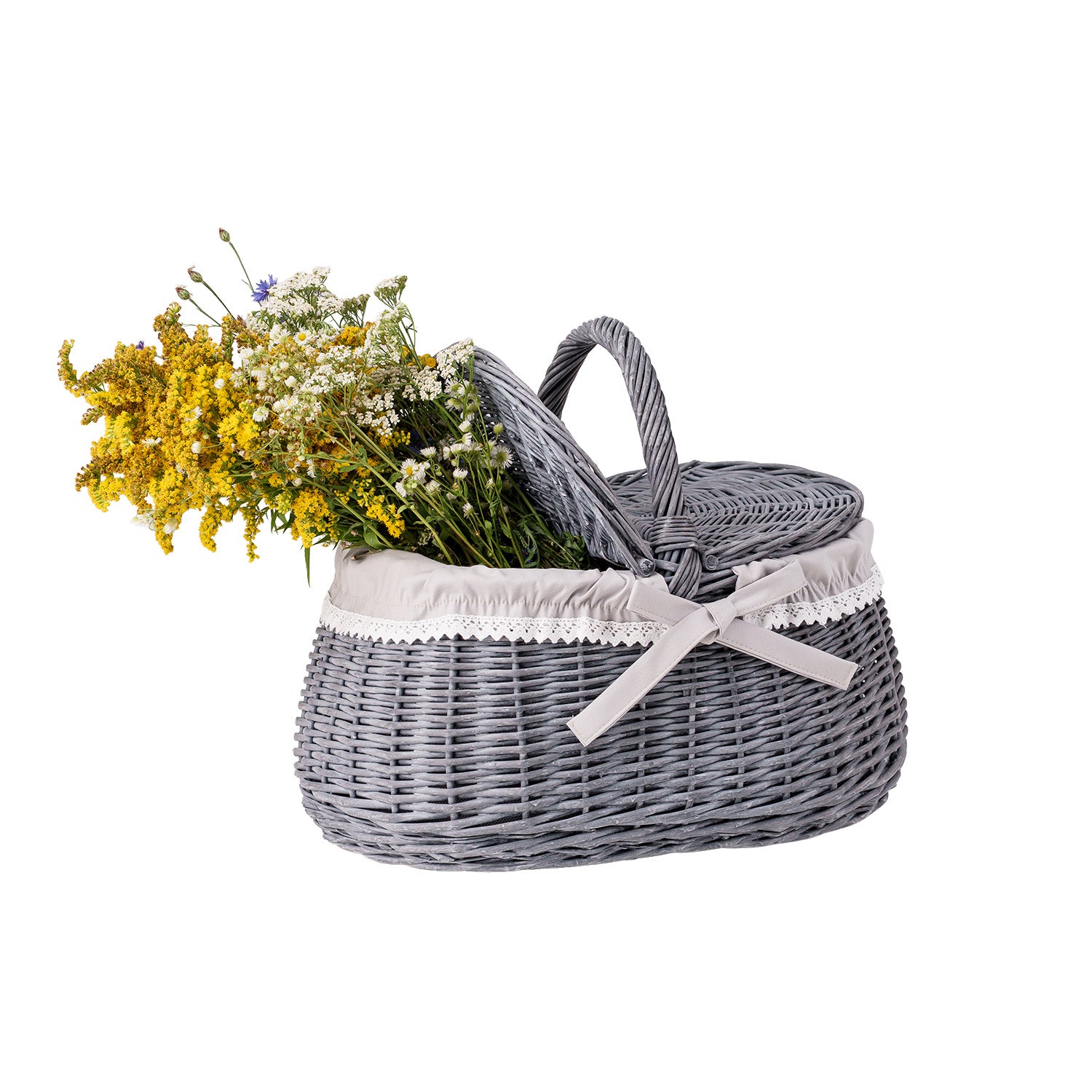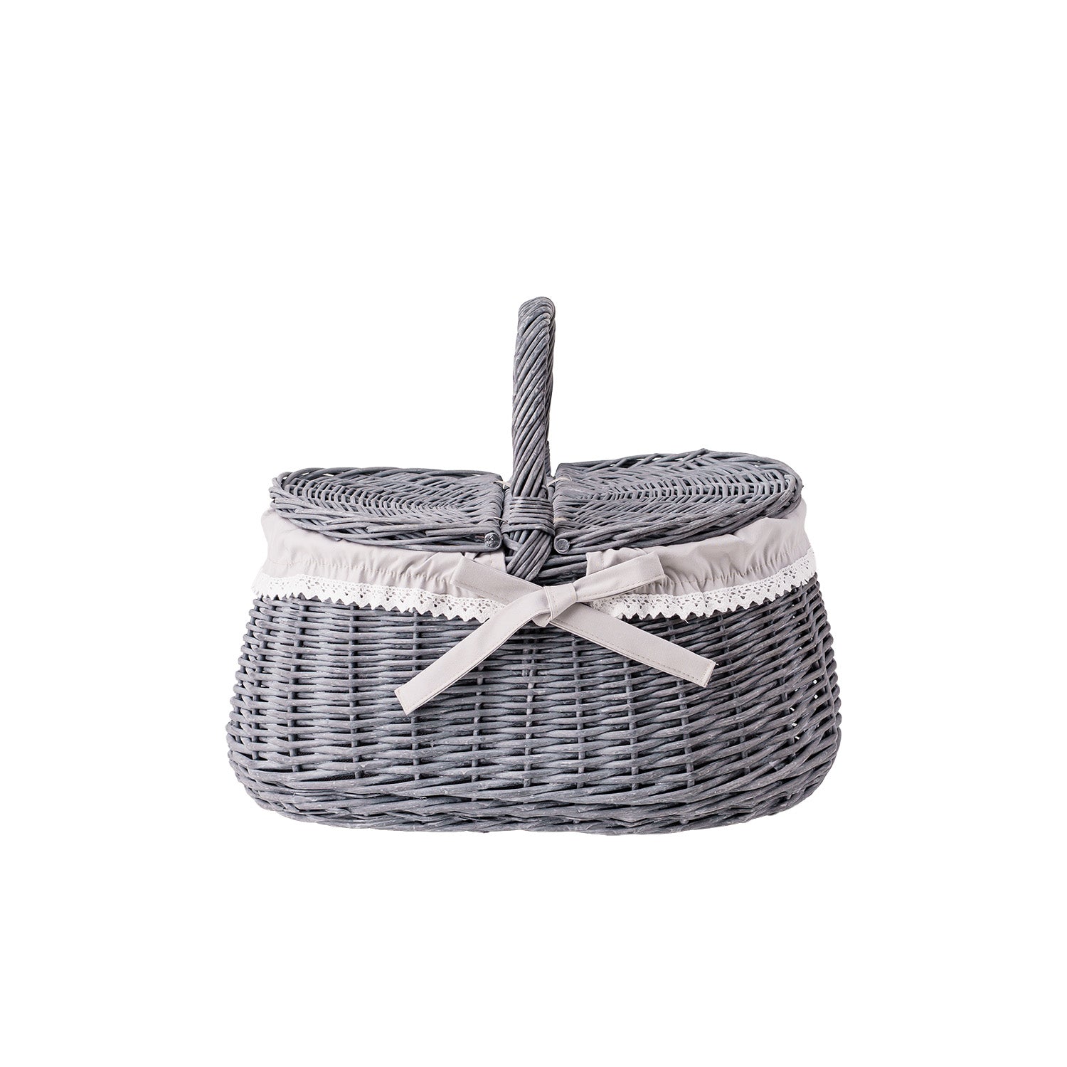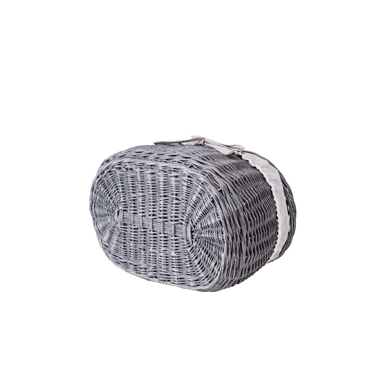 Το οβάλ καλάθι πικνίκ από γκρι ψάθα έχει ήρεμη, κομψή φόρμα και προσεγμένες λεπτομέρειες. Ο πυκνός πλέκτης και τα ομοιόμορφα τοποθετημένα κλωναράκια δημιουργούν μια σταθερή κατασκευή που διατηρεί το σχήμα της. Το εσωτερικό έχει φινίρισμα με μπεζ υφασμάτινη επένδυση, όμορφα διπλωμένη στην άκρη. Στην κορυφή υπάρχει ένα πρακτικό καπάκι και μια άνετη χερούλι μεταφοράς που εξασφαλίζει σταθερό κράτημα. Η επένδυση αφαιρείται και μπορεί να πλυθεί στο πλυντήριο στους 30°C.