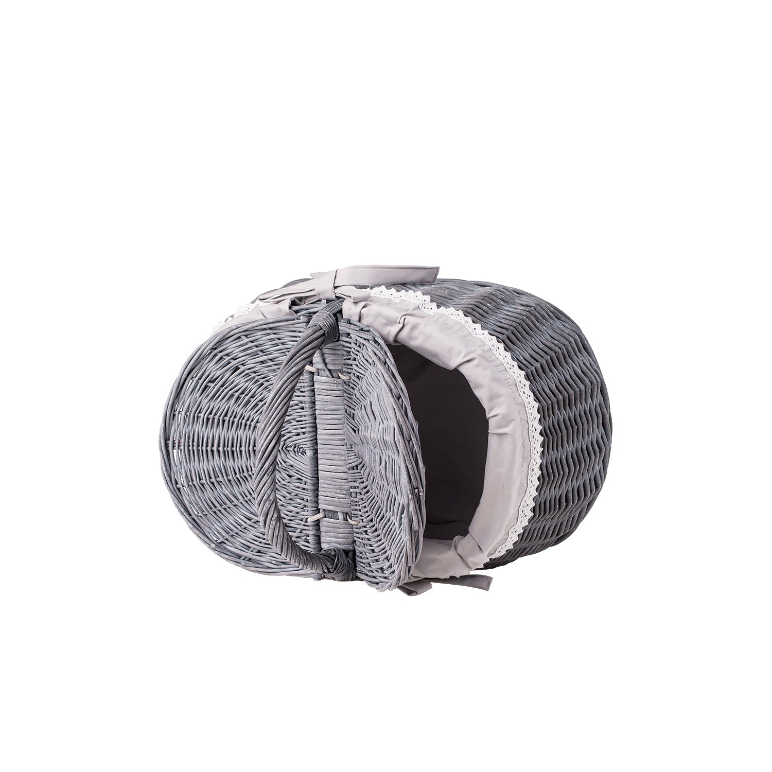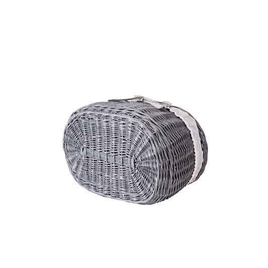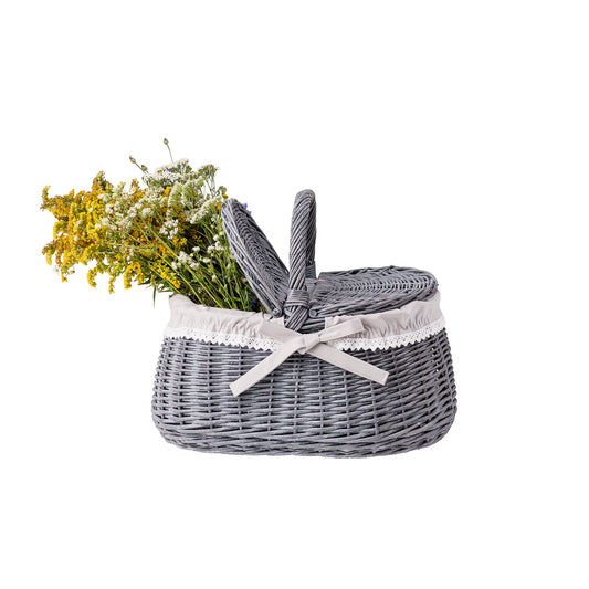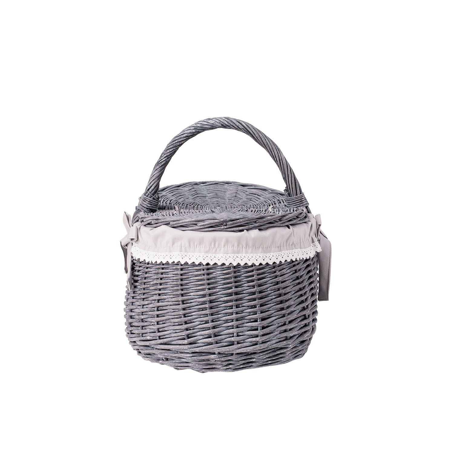 Το οβάλ καλάθι πικνίκ από γκρι ψάθα έχει ήρεμη, κομψή φόρμα και προσεγμένες λεπτομέρειες. Ο πυκνός πλέκτης και τα ομοιόμορφα τοποθετημένα κλωναράκια δημιουργούν μια σταθερή κατασκευή που διατηρεί το σχήμα της. Το εσωτερικό έχει φινίρισμα με μπεζ υφασμάτινη επένδυση, όμορφα διπλωμένη στην άκρη. Στην κορυφή υπάρχει ένα πρακτικό καπάκι και μια άνετη χερούλι μεταφοράς που εξασφαλίζει σταθερό κράτημα. Η επένδυση αφαιρείται και μπορεί να πλυθεί στο πλυντήριο στους 30°C.