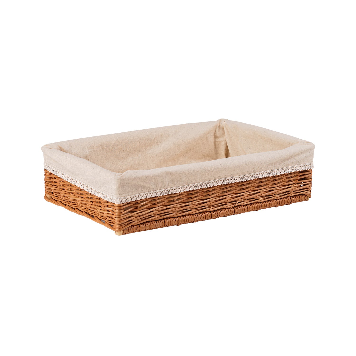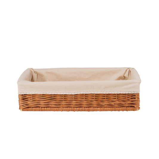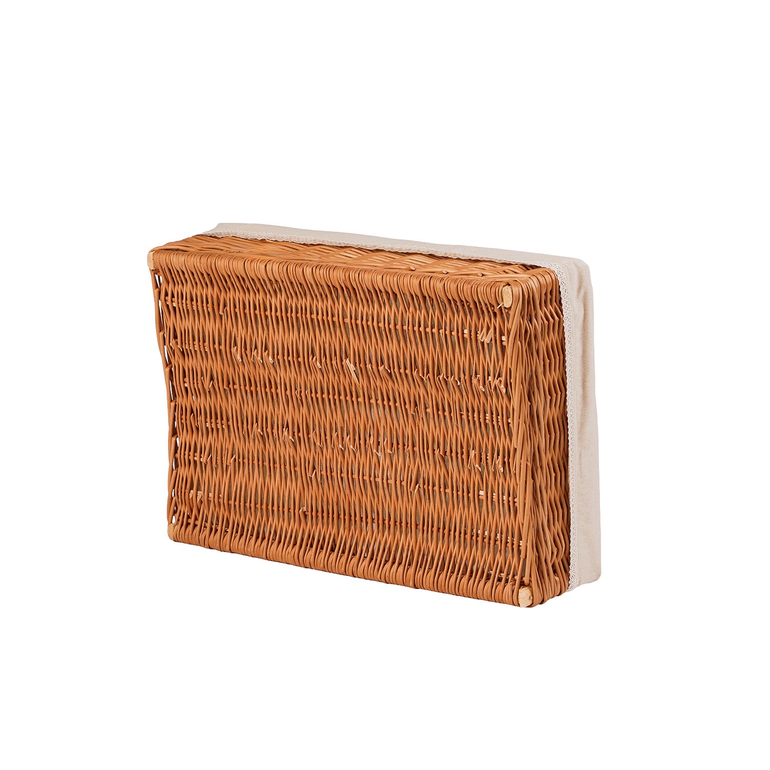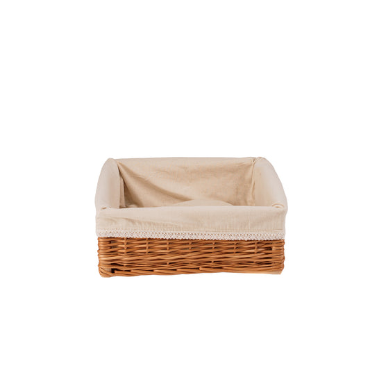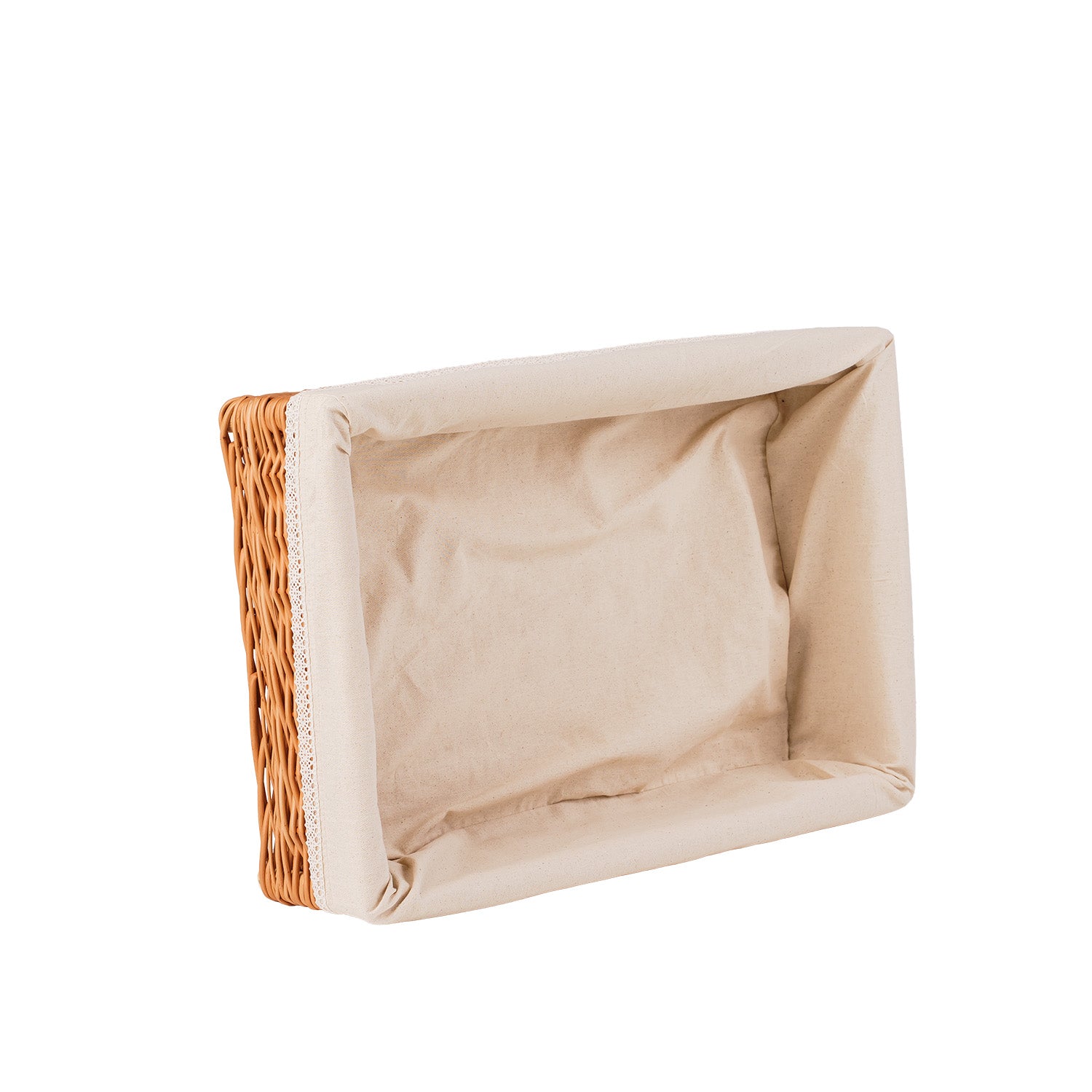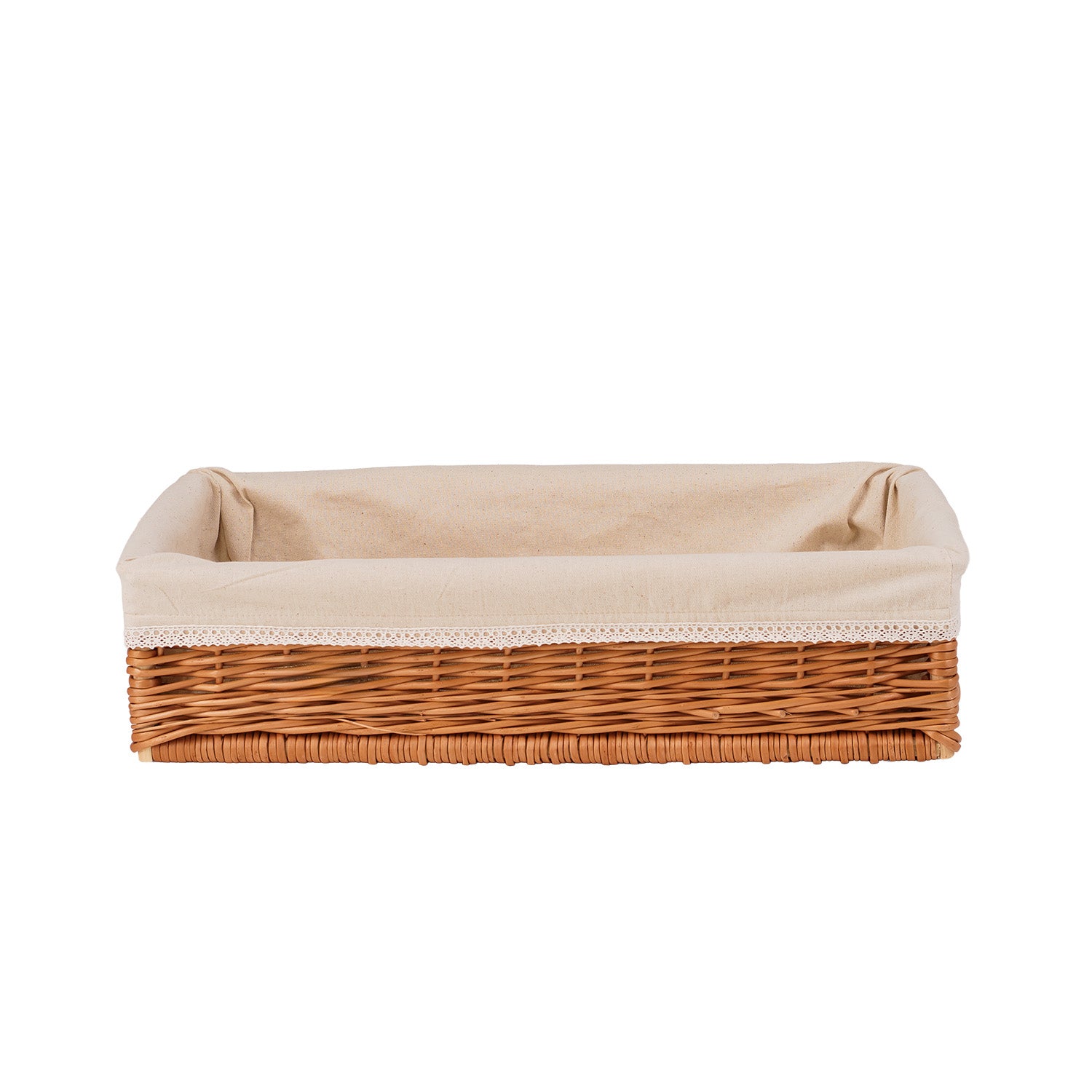 Ορθογώνιο ψάθινο καλάθι σε φυσική, ανοιχτή απόχρωση, φινιρισμένο με μπεζ υφασμάτινη επένδυση. Οι πυκνά πλεγμένες πλευρές και ο ίσιος πάτος εξασφαλίζουν σταθερότητα στην έκθεση, ενώ η καλοδουλεμένη στεφάνη προσφέρει καθαρή και επαγγελματική εμφάνιση. Το ουδέτερο ύφασμα στο εσωτερικό οργανώνει το καλάθι και αναδεικνύει όμορφα τα αρτοποιήματα.