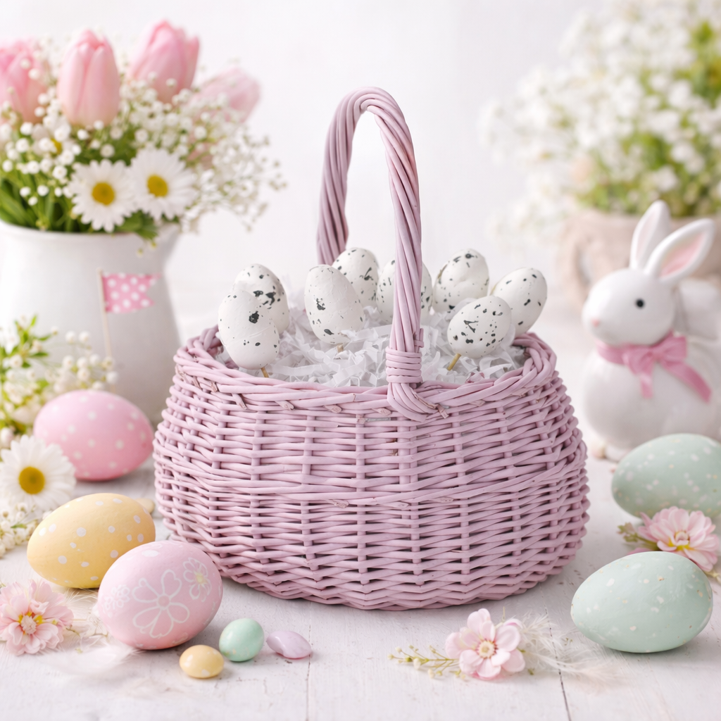 Choisissez un panier tressé à la main en osier naturel – durable, écologique et prêt à apporter élégance et simplicité à vos Pâques.
