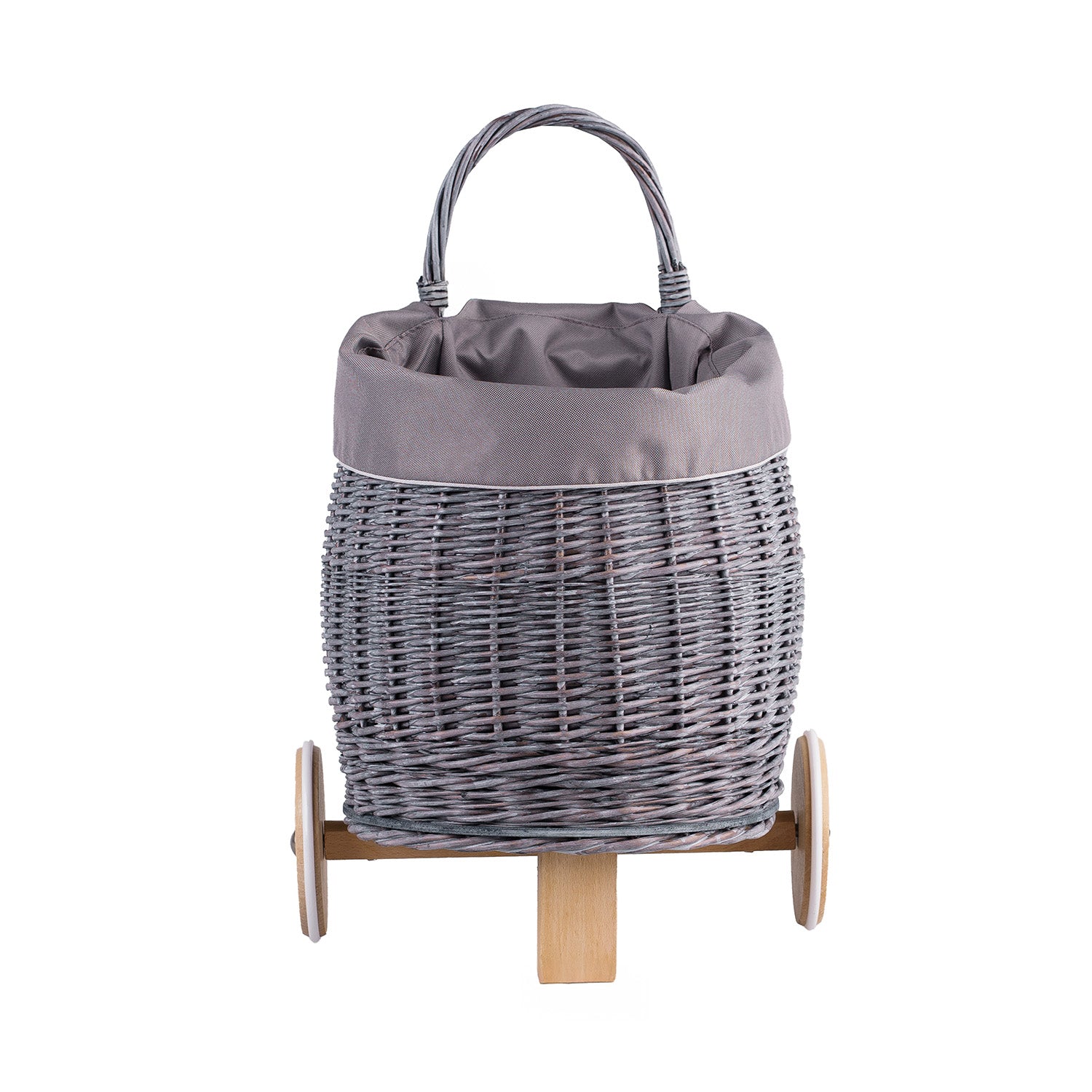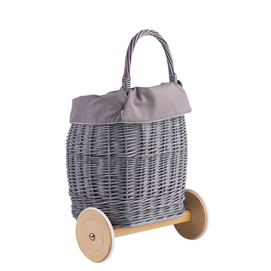 Luke Poussette en osier pour enfants avec doublure grise, poignée et roues en bois.