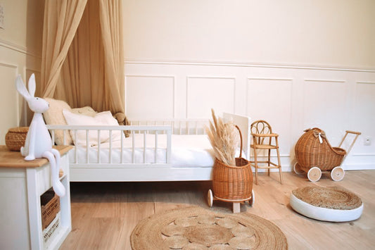 Accessoire de jeu polyvalent : il sert de poussette pour poupées, de transport pour peluches et blocs, ainsi que d’aide à l’apprentissage du fait de pousser et de garder l’équilibre. La poignée en osier assure une prise sûre et les roues en bois facilitent une conduite fluide sur le sol de la maison. La doublure douce range les petits objets et limite leur chute, tout en faisant du panier un élément esthétique de la chambre d’enfant.