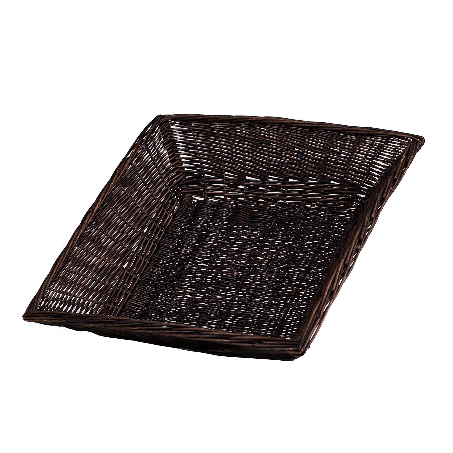 Panier de boulangerie carré dans une teinte wengé brun profond qui souligne le caractère élégant de la présentation. Un tressage régulier et dense ainsi que des bords soigneusement finis créent une forme stable et esthétique, et la base plate assure une pose sûre sur le comptoir. La construction ouverte favorise un accès pratique aux petits pains, croissants et autres viennoiseries, tout en maintenant l'ordre dans l'espace de vente.