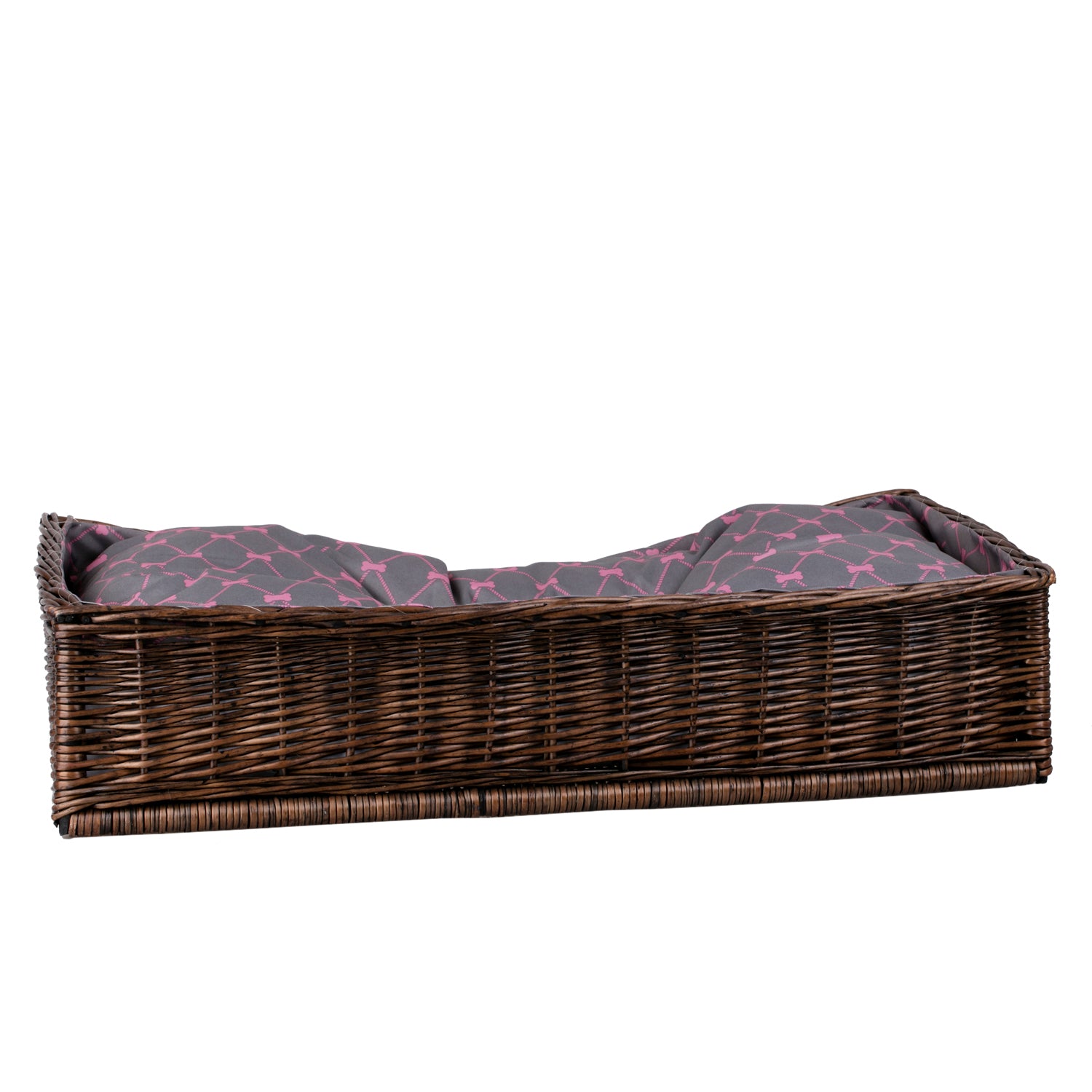 Questo elegante letto in vimini conquista con la sua trama uniforme in una calda tonalità marrone. La struttura rettangolare presenta il fronte leggermente ribassato, facilitando l'accesso anche ai piccoli animali. La base stabile mantiene la forma e si adatta bene a ogni tipo di pavimento. Un morbido cuscino grigio con motivo a quadretti rosa completa l'estetica. La tonalità neutra si abbina facilmente a ambienti moderni e classici.