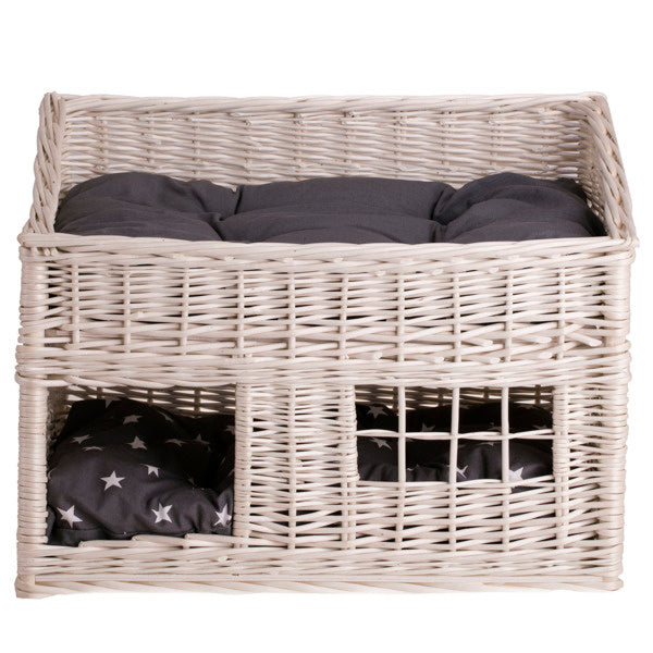 Estrella casetta per gatto in vimini con cuscini grigi, su due livelli con finestrella