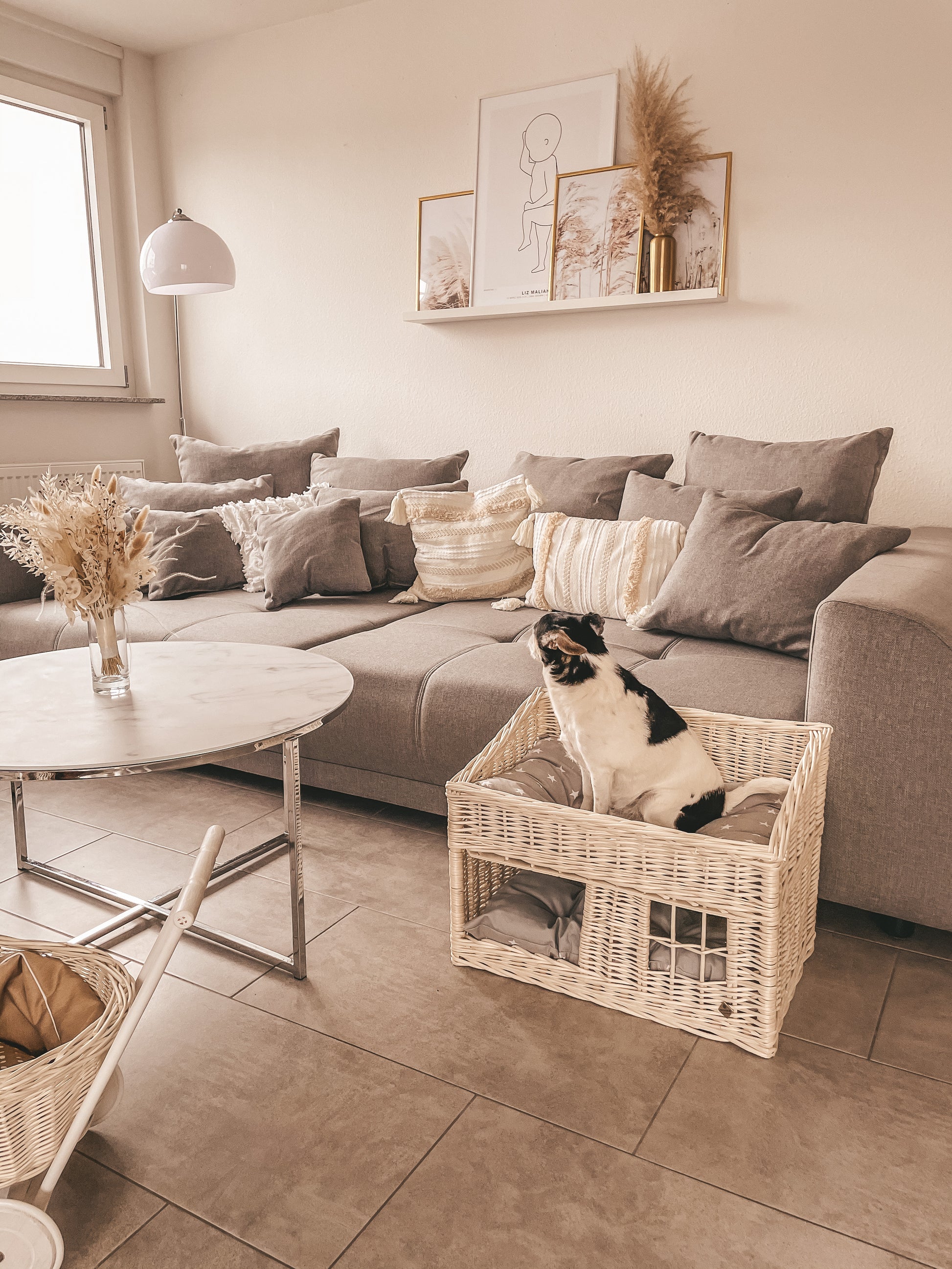 La casetta rettangolare per gatti a due livelli unisce la leggerezza del vimini a una elegante tonalità crema. La parte inferiore crea un rifugio riparato con un piccolo oblò e un ingresso ampio, mentre la parte superiore è una cuccia aperta con bordo rialzato. La tessitura fitta e uniforme ha un aspetto decorativo e conferisce rigidità alla forma. La griglia frontale filtra la luce con delicatezza e i bordi accuratamente levigati donano una finitura armoniosa. Nel set sono inclusi due cuscini morbidi grigi, adatti a entrambe le zone di riposo.