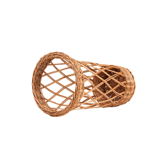 Een hoge, cilindervormige rieten mand voor stokbrood valt op door zijn lichte vorm en zorgvuldige afwerking. De open, gekruiste vlecht van de zijkanten vormt een opvallend gaas dat het brood mooi tentoonstelt en vrije luchtstroom mogelijk maakt. De bovenkant wordt afgesloten met een brede, stevige rand, de onderkant met versterkt vlechtwerk die een stabiele basis vormt. De mand heeft geen voering of handvatten – hij is eenvoudig, praktisch en klaar voor dagelijks gebruik.
