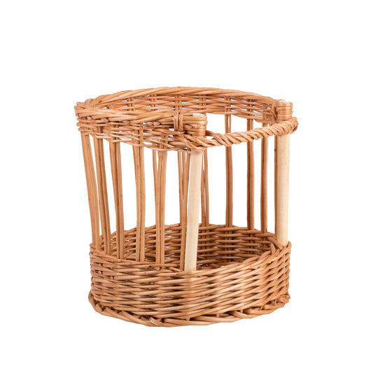 Deze rotanmand voor baguettes valt op door zijn eenvoudige, ambachtelijke uitstraling. Hij heeft een open, cilindrische vorm met een dicht gevlochten bodem en stevige, verticale spijlen die een luchtige constructie creëren. De boven- en onderrand zijn extra omlijst met een decoratieve vlecht, wat de stabiliteit vergroot. De natuurlijke, honingkleurige tint van rotan brengt warmte in het interieur. Zonder voering en zonder handvatten.