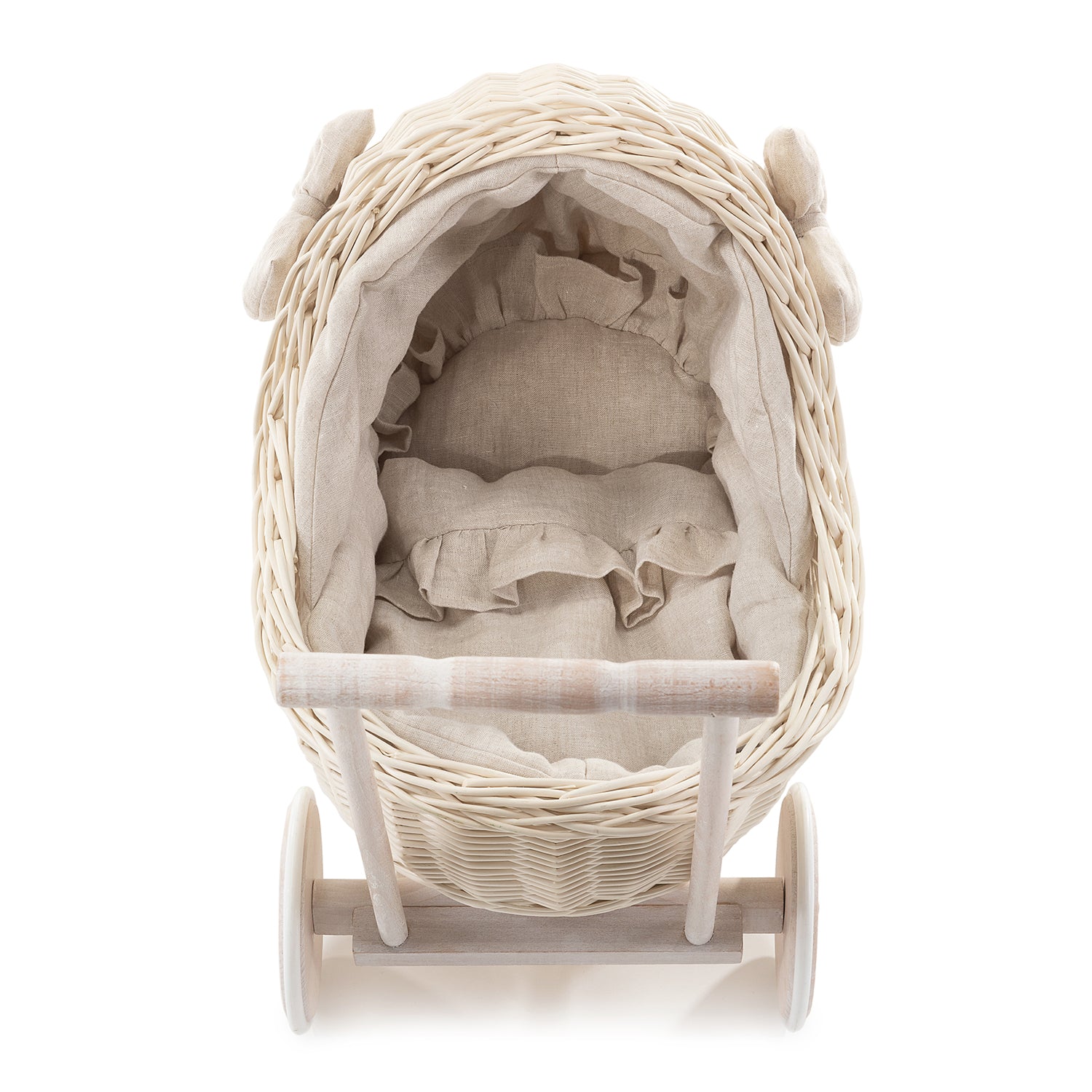 Deze elegante, gevlochten rieten poppenwagen valt op door de zorgvuldige afwerking van elk detail. De gevlochten mand vormt een harmonieus, dicht vlechtwerk en het interieur is bekleed met zacht, crème linnen boord met een subtiel volantje. Aan de zijkant van de kap zit een decoratieve linnen strik. Het gladde houten handvat en vier wielen met een witte rubberen rand maken het klassieke, tijdloze uiterlijk compleet, dat prachtig staat in de kinderkamer.