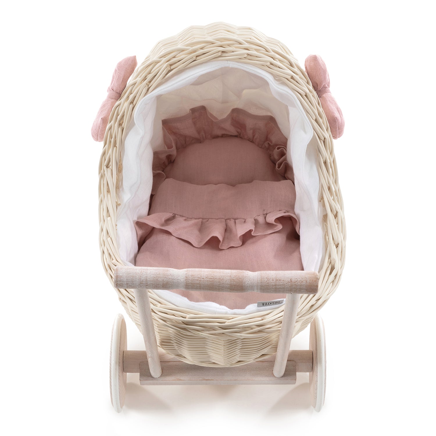 Desayer Rieten poppenwagen met linnen afwerking en roze beddengoed voor poppen, inclusief dekentje, kussentje en handvat