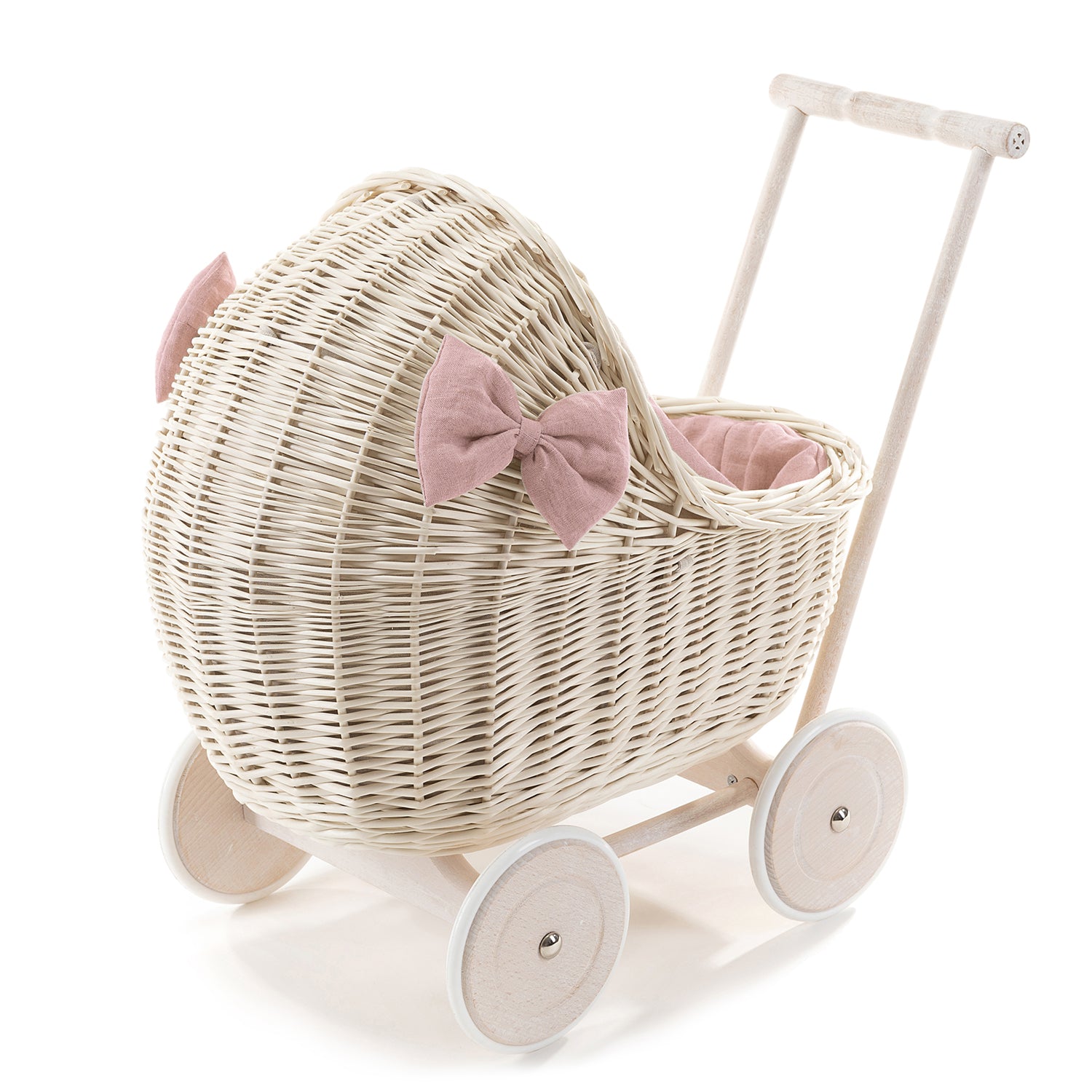 De charmante DESAYER poppenwagen valt op door het lichte, zorgvuldig gevlochten wilgenvlechtwerk en elegante details. Het interieur, gevoerd met zacht linnen, omsluit de speelgoedjes, terwijl het roze beddengoed met een subtiele ruche en een roze strik een verfijnde uitstraling geven. De lichte houten wielen en het comfortabele handvat maken het geheel compleet. De wielen hebben subtiele rubberen randen die het rijgedrag verbeteren.