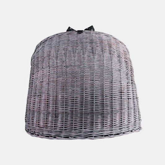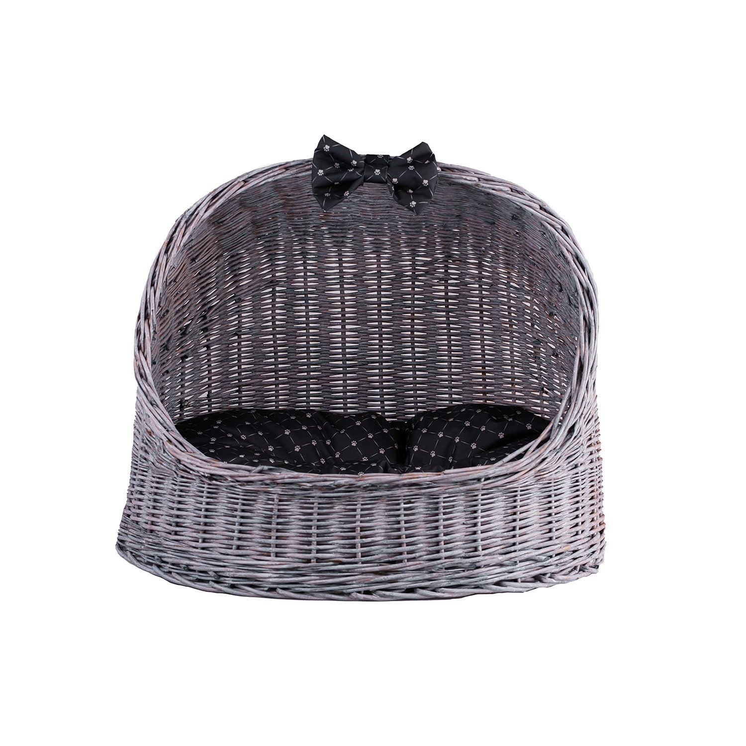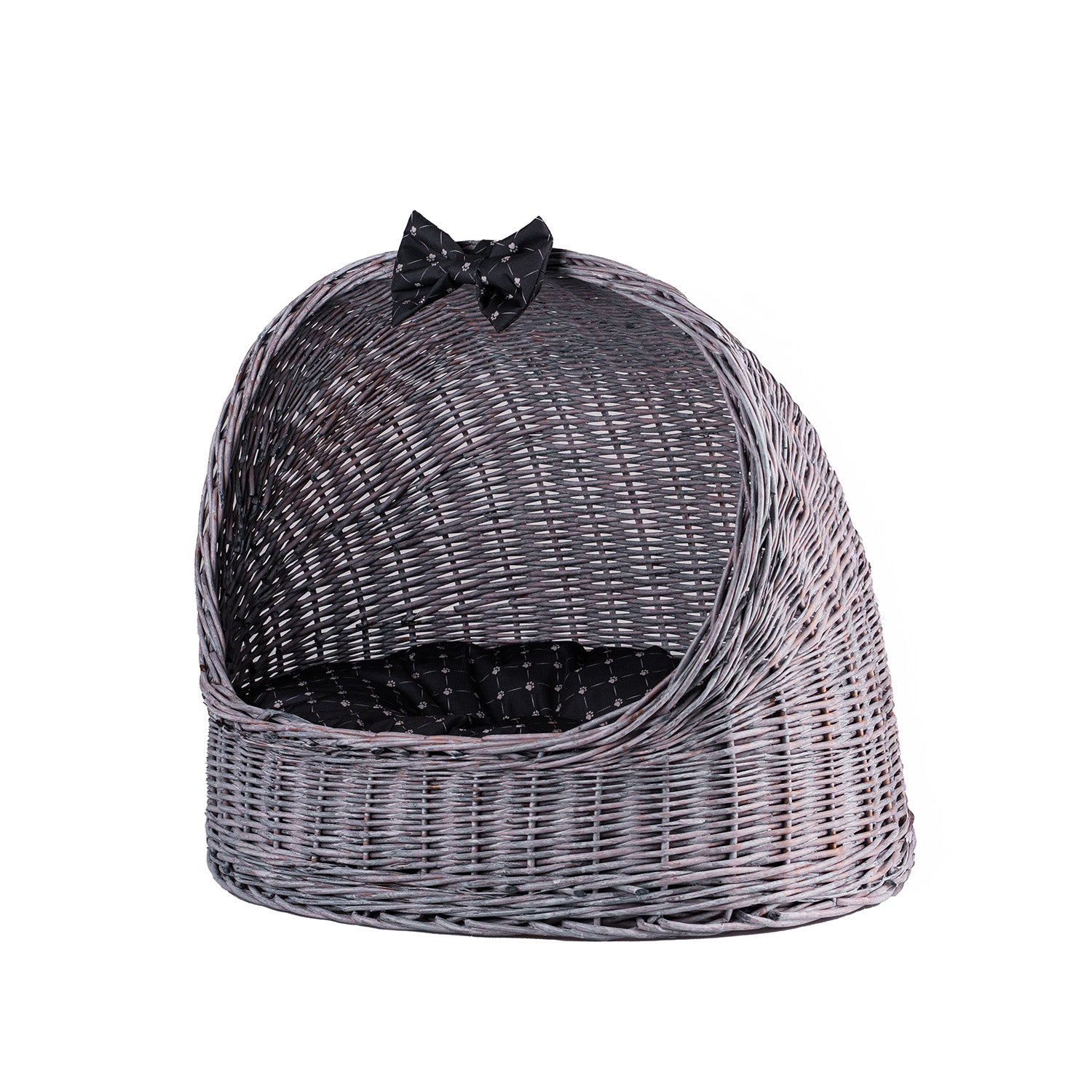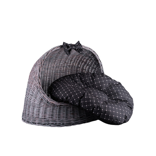 Een stijlvolle rietwoning in een grijs‑zwarte tint combineert esthetiek met gezelligheid. Het ovale lichaam met een halfbolvormig dak creëert een beschutte, rustige ingang waar uw huisdier zich veilig en ontspannen voelt. De vlecht is dicht en gelijkmatig, de randen zacht afgerond en de stabiele bodem houdt de vorm. Binnen ligt een zacht, op maat gemaakt kussen en bovenop voegt een subtiele strik extra charme toe. Elk detail – van de rand rond de ingang tot de afwerking van de onderrand – is zorgvuldig uitgewerkt om scherpe uiteinden te vermijden en volledig comfort te garanderen.