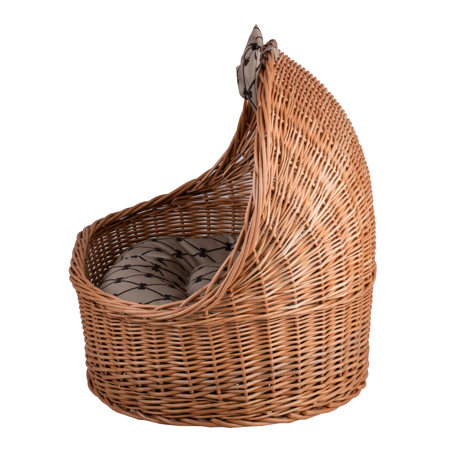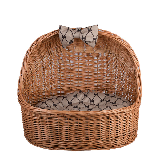 Een elegant ligplaatsje van natuurlijk wilgenriet valt op door zijn tijdloze uitstraling. De ovale basis en de hogere, halfronde rug creëren een knusse nis voor je huisdier, terwijl de dichte, gelijkmatige vlecht subtiel glanst in een honingkleurige tint. De brede, lage instap maakt het toegankelijk en het ontbreken van overbodige details benadrukt de lichtheid van de vorm. Binnenin ligt een zacht beige kussen met een delicaat patroon dat het geheel harmonieus afrondt en elegantie toevoegt. De randen zijn zorgvuldig afgerond, waardoor het geheel er netjes uitziet en prettig aanvoelt. Door het decoratieve karakter staat het mandje prachtig in elke ruimte.