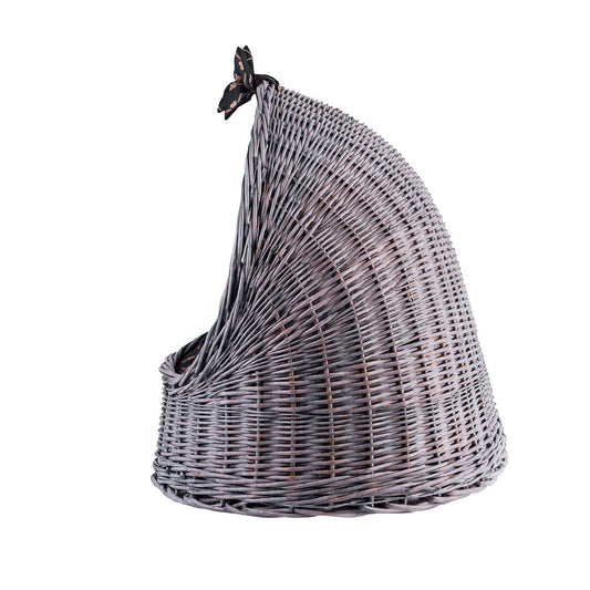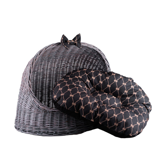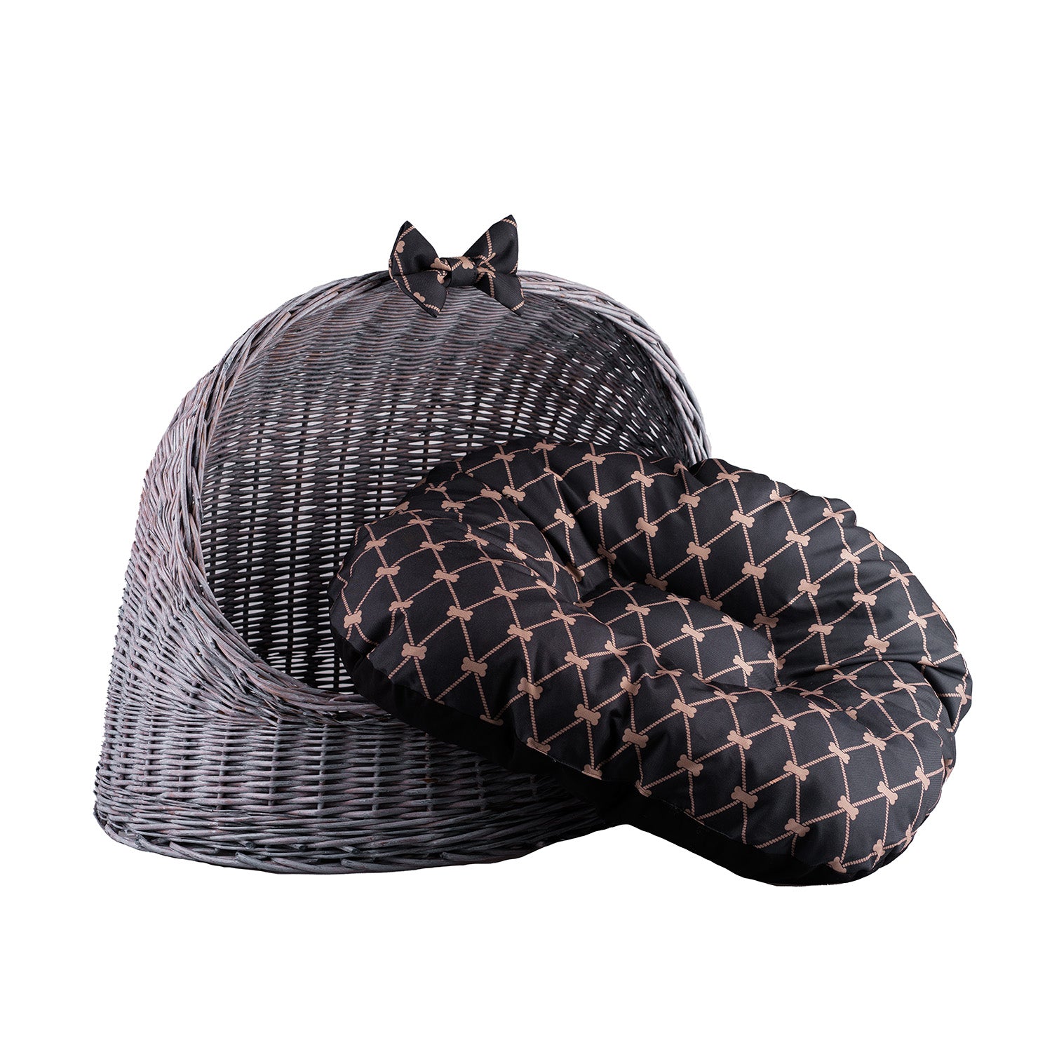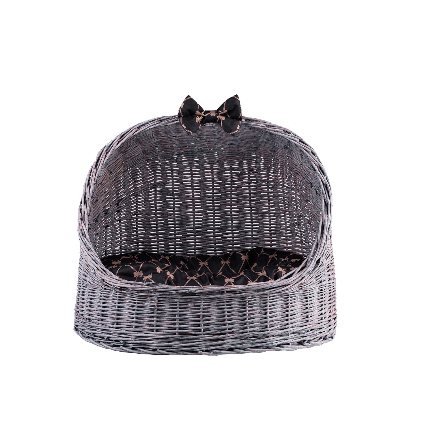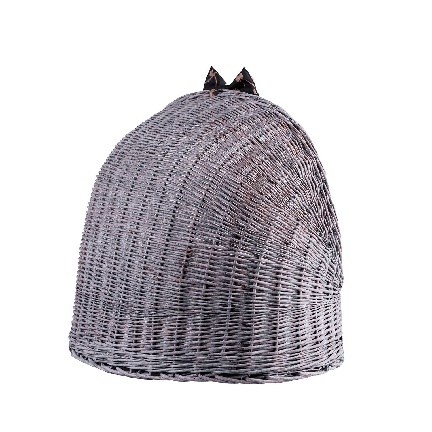 Een elegante huis voor huisdieren van natuurlijk riet, die betovert met zijn grijs-zwarte kleurstelling en verfijnde, gelijkmatige vlecht. De ovale basis en de halfkoepelvormige wand creëren een knusse nis met een brede opening en een lage drempel, comfortabel zelfs voor oudere huisdieren. Binnenin ligt een zachte, waterdichte kussen, en de glad afgewerkte randen en decoratieve details benadrukken de hoge kwaliteit van de afwerking. Het geheel oogt stijlvol en zal elke ruimte verfraaien.