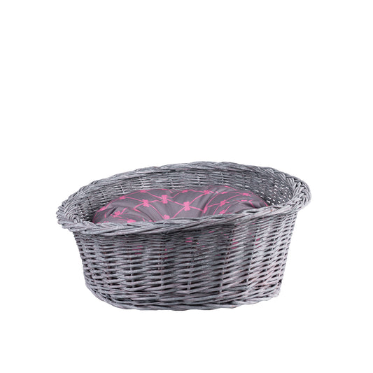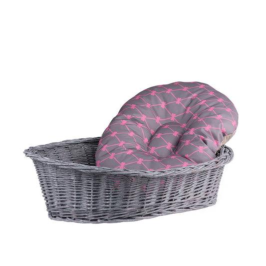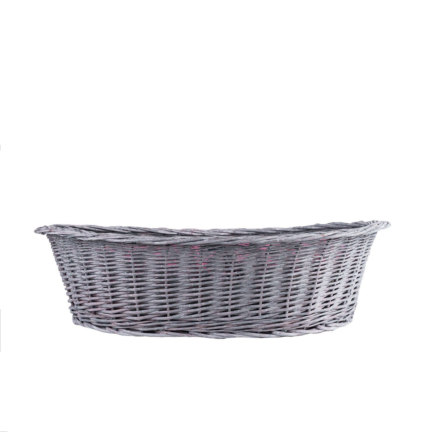 Een elegant grijs geschilderd rotan-/rietmandje valt op door zijn klassieke, ovale lijn en de lage instap aan de voorkant die het dagelijks gebruik vergemakkelijkt. De rand is afgewerkt met een dikke, zorgvuldig gevlochten rol en de dichte vlecht geeft het geheel een nobele lichtheid. Bij het setje hoort een zachte, uitneembare kussen in grijstinten met een subtiel roze patroon, wat extra gezelligheid geeft.
