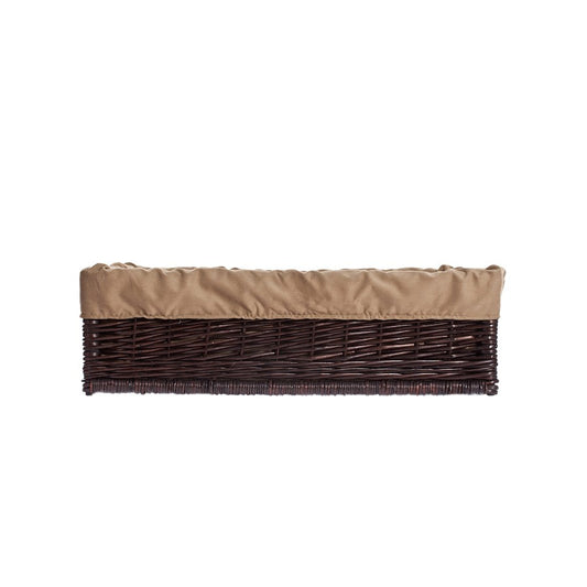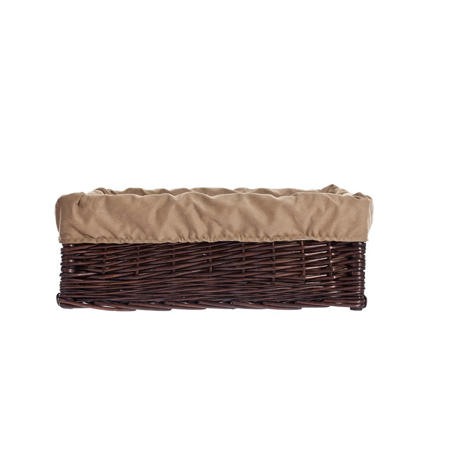 Een elegant rieten honden-/kattenslaapplaats in donkerbruin valt op door zijn strakke lijnen en nauwkeurig vlechtwerk. De rechthoekige vorm met een lage instap maakt het voor uw huisdier gemakkelijk om in- en uit te stappen, terwijl hogere zijkanten een knusse, beschutte ruimte creëren. De binnenkant is bekleed met een beige, zachte rand en een kussen die de randen van de mand omsluiten voor extra comfort.