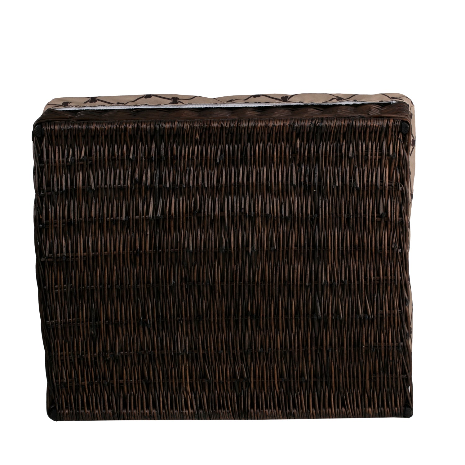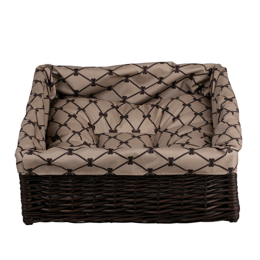 Een stijlvolle ligmand van natuurlijk wilgenriet combineert esthetiek en comfort en creëert een knusse rustplek voor uw huisdier. Hij heeft een rechthoekige vorm met lage, gelijkmatige zijden en een stabiele bodem, waardoor hij licht oogt maar zijn vorm behoudt. De donkerbruine mand vormt een mooi contrast met de beige afwerking en het zachte kussen omlijst het dier en nodigt uit tot een dutje.
