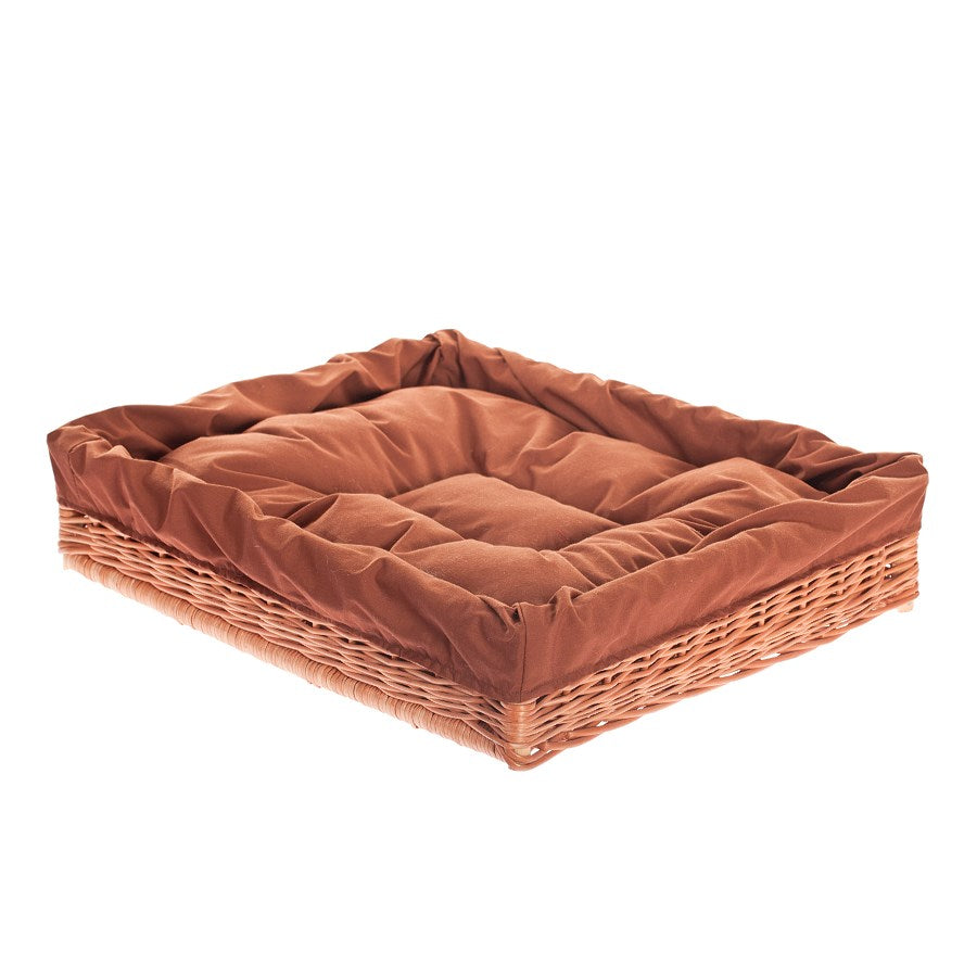Een elegant ligplekje van natuurlijk wilgenhout (riet) creëert een gezellig rustpunt. De rechthoekige vorm met een verlaagde voorkant vergemakkelijkt het in- en uitstappen, en de dichte, gelijkmatige vlecht en zorgvuldig afgewerkte rand geven een subtiel karakter. Bij de set hoort een zacht, bruin kussen met lichte quilting dat isoleert tegen een koude vloer en voor zachtheid zorgt.