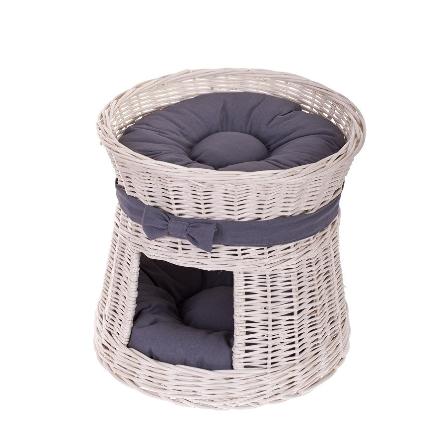 Elegante, ronde kattenwoning combineert natuurlijk crèmekleurig wilgentenen met grafietkleurige stofaccenten. De onderste laag is een afgesloten ligplek met een comfortabele opening, bovenaan bevindt zich een zacht gestoffeerd terras. Dichte vlecht en een stabiele, brede basis vergroten het vertrouwen in het gebruik. Het geheel is versierd met een bandje met strik en twee uitneembare kussens.