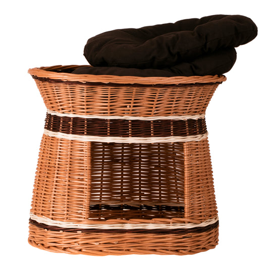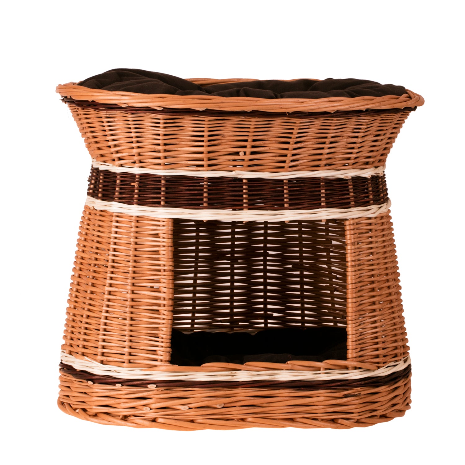 Een elegante gevlochten wilgenhuis voor katten en kleine honden valt op door zijn natuurlijke afwerking en gelijkmatige, dichte vlecht. De ovale silhouet loopt licht taps toe naar boven, wat zorgt voor een stabiele basis en een brede, comfortabele rand. Aan de voorkant is een ruime opening ontworpen die leidt naar een knusse schuilplaats. Bovenop bevindt zich een tweede rustzone met een zacht kussen, en de stroken wilgentenen in licht- en donkerbruin geven het geheel een elegante uitstraling. De licht golvende rand benadrukt het ambachtelijke karakter en nodigt uit tot uitrekken en liggen na het spelen.