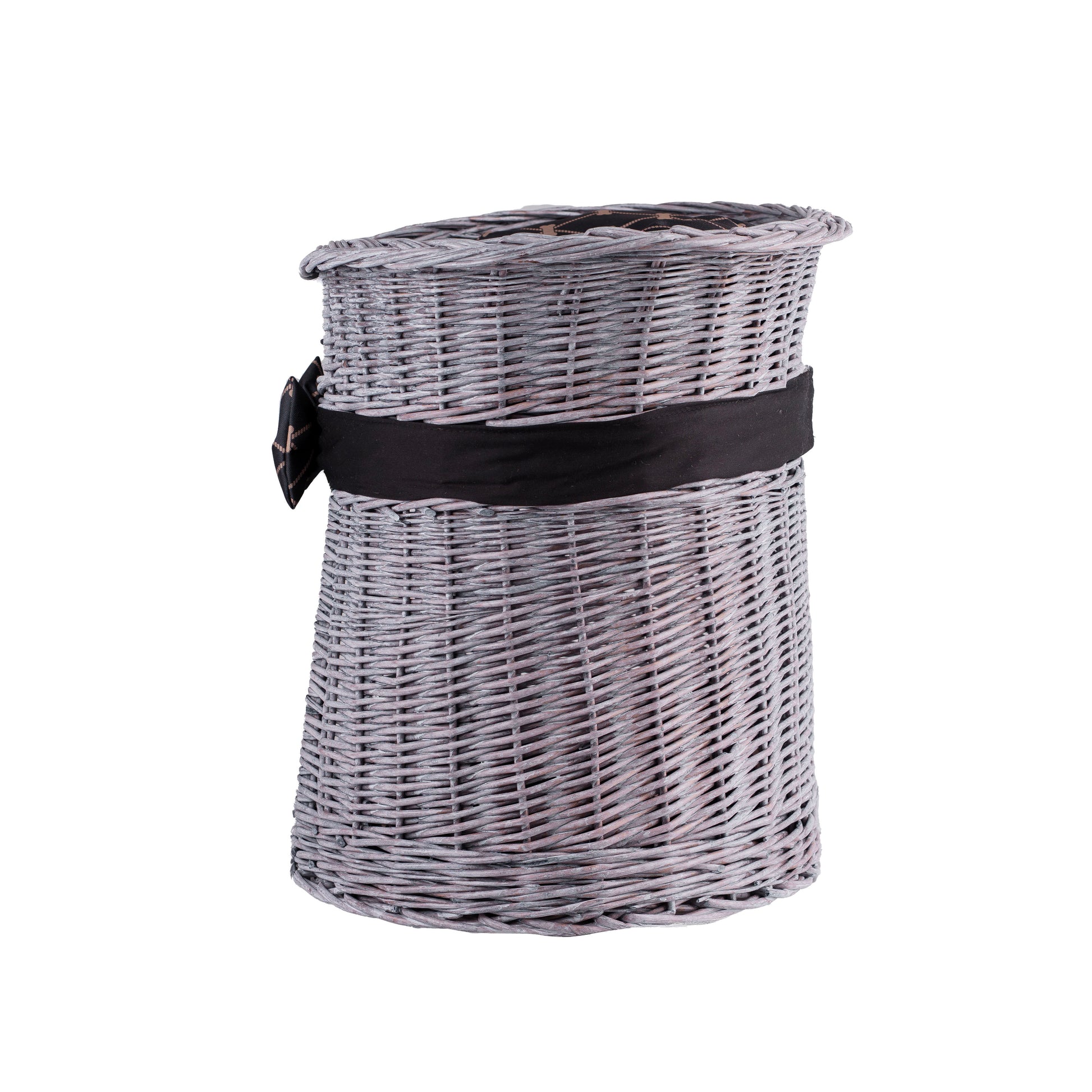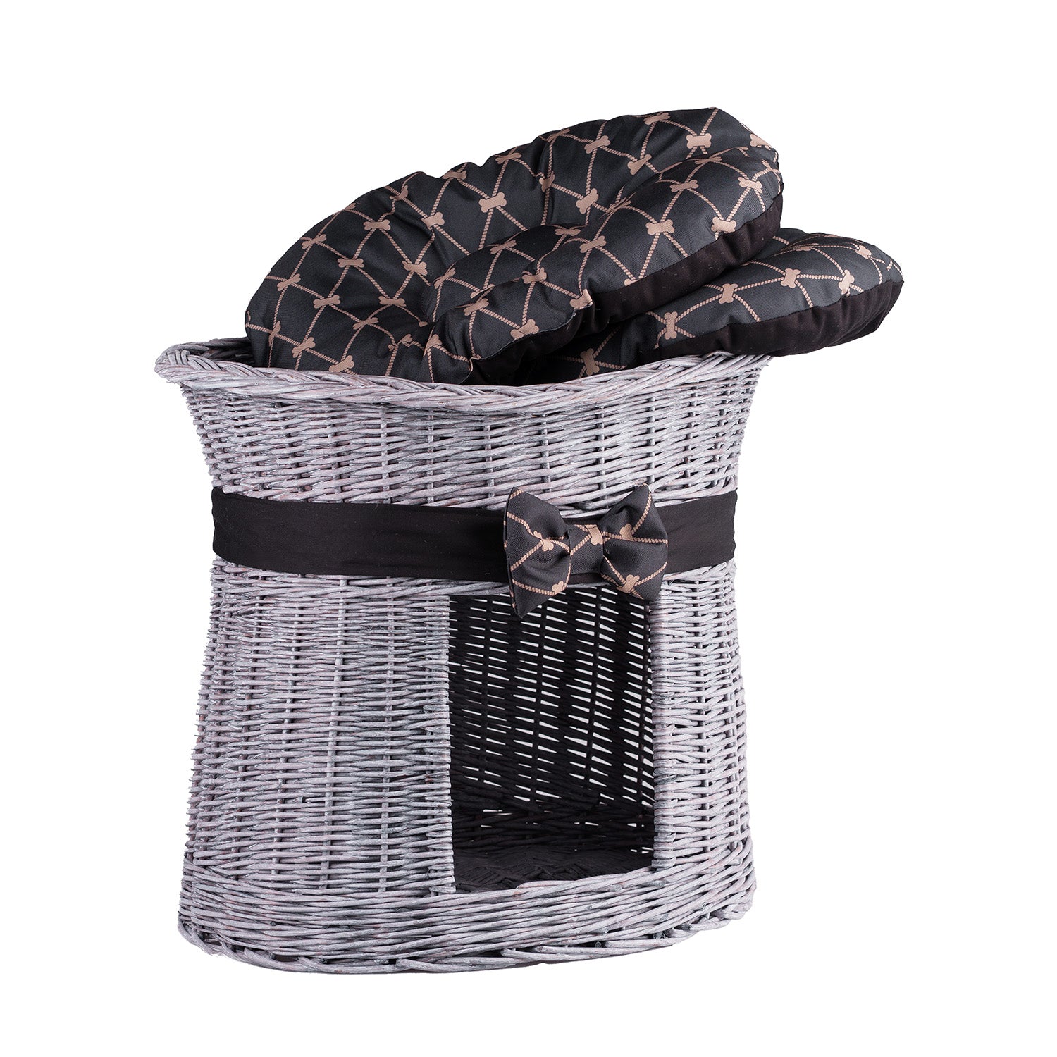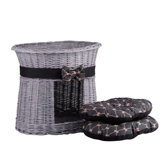 Een elegant grijs wilgentenen kattenhuis valt op door het verfijnde vlechtwerk en een decoratief zwart lint met strik. De ovale vorm met een licht uitlopende bovenkant vormt bovenop een stabiel ligplaats, en aan de voorkant bevindt zich een comfortabele ingang naar het onderste schuilgedeelte. Het interieur wordt aangevuld met zachte zwarte kussens met een subtiel patroon, en de grijze afwerking accentueert mooi de structuur van het vlechtwerk. Een geprofileerde rand geeft het geheel luchtigheid en helpt de kussens op hun plek te houden.