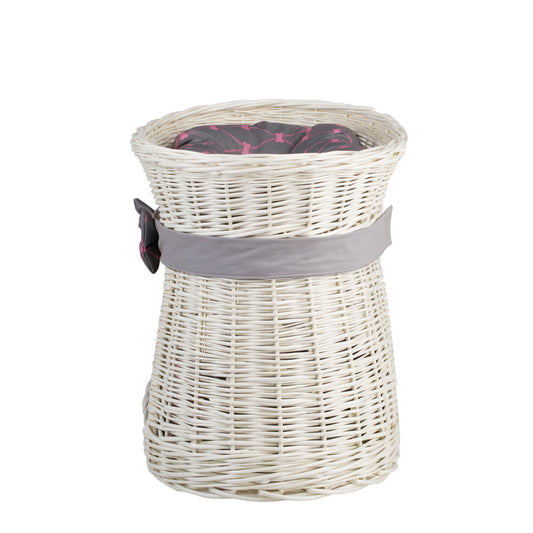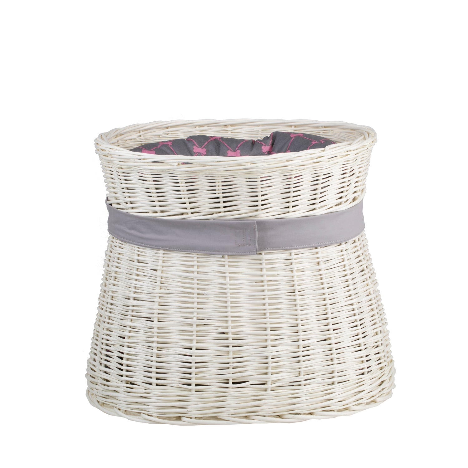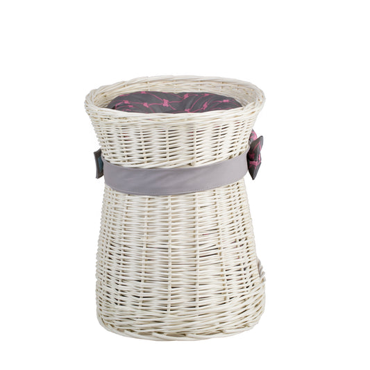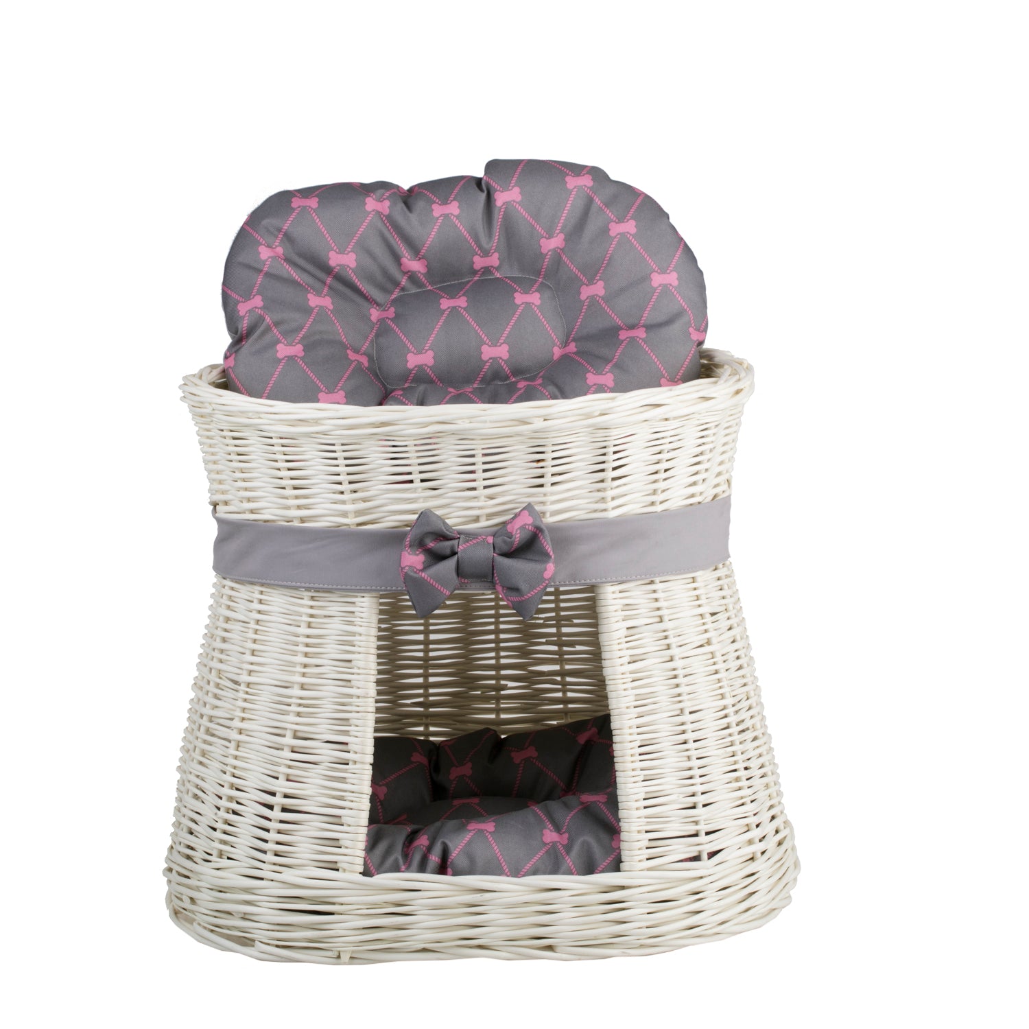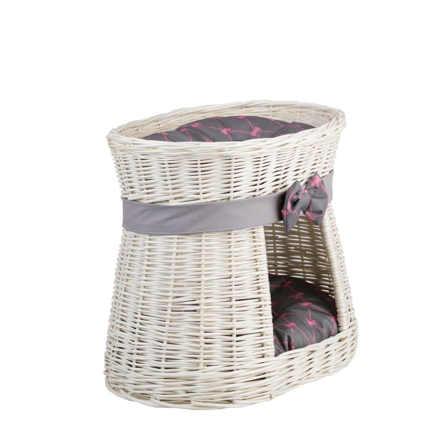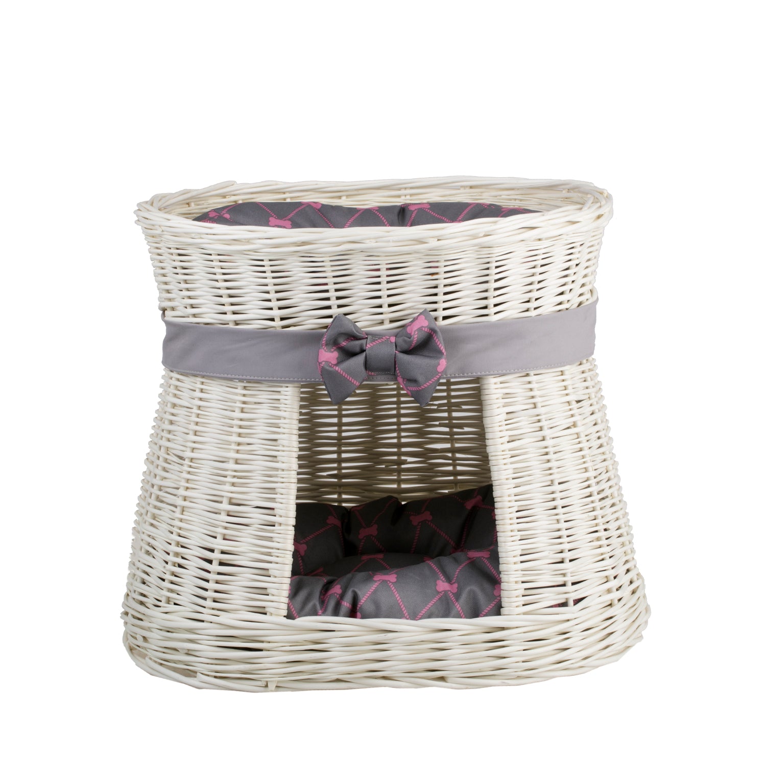 Een elegant, ovaal kattenhuisje van crèmekleurig riet dat betovert met een lichte vorm en verzorgde afwerking. Een brede opening leidt naar een knusse ligplaats, en boven is er een open platform om te liggen. Dichte vlecht en een licht omgeslagen rand zorgen voor stabiliteit. Het geheel wordt gecompleteerd door een grijze band met decoratieve strik en twee zachte, grijze kussens met een subtiel roze patroon.