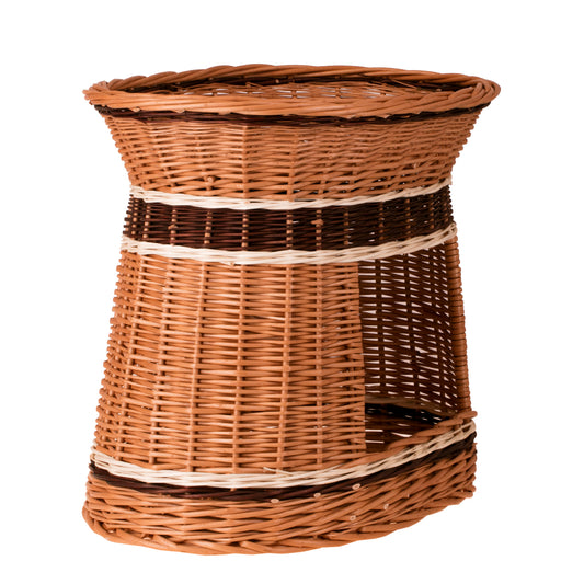 De mand staat prachtig in de woonkamer, slaapkamer of bij het raam, waar het bovenste niveau een echt uitkijkpunt wordt. Het natuurlijke karakter van wilg past bij Scandinavische, boho en moderne interieurs. Het product is licht, dus je kunt het gemakkelijk verplaatsen tijdens het schoonmaken. Afmetingen ca. 50 × 40 × 45 cm (h.) maken het eenvoudig om het huisje in kleinere en grotere ruimtes te integreren.
