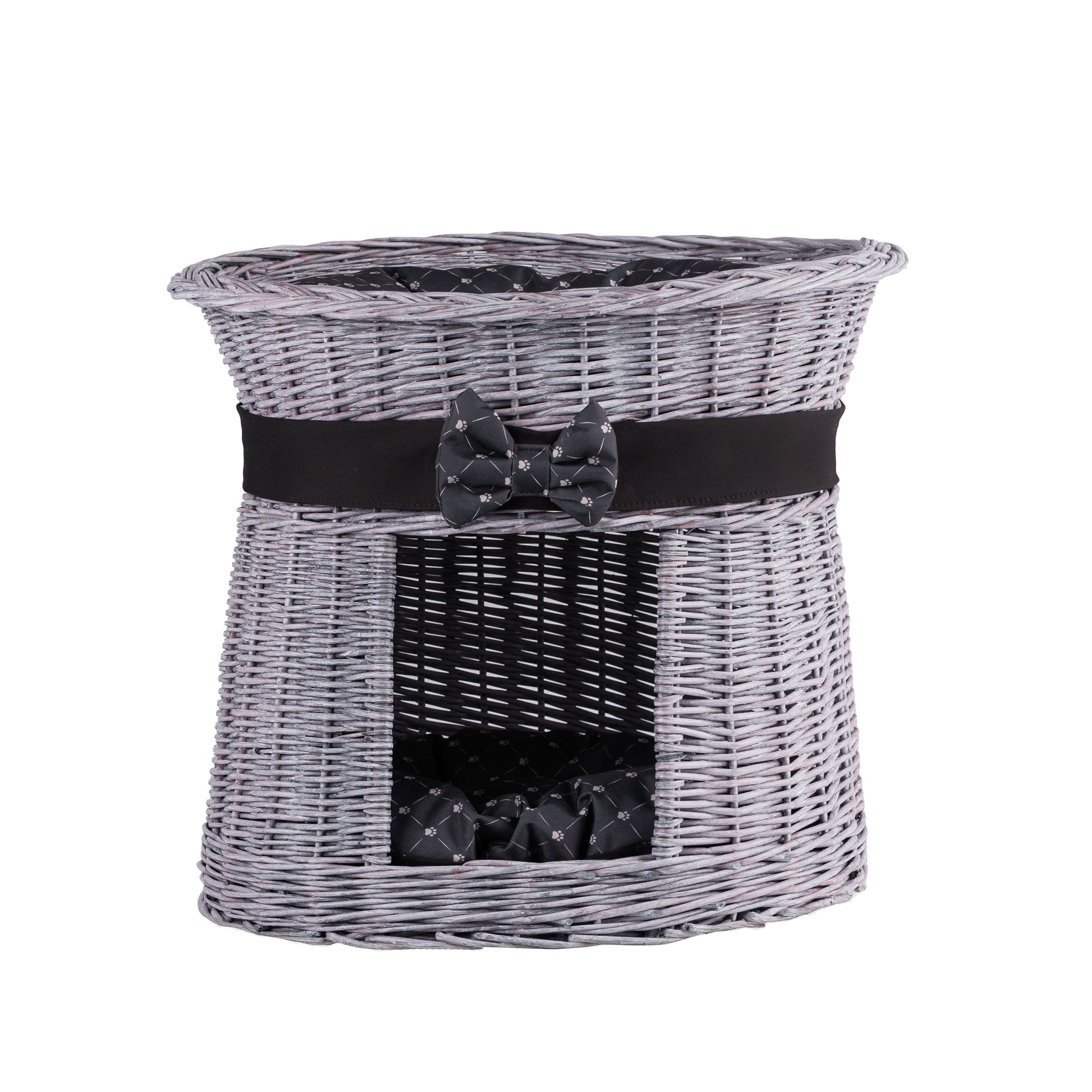 Een elegant kattenhuis van grijs wilgentenen trekt de aandacht met zijn vakkundige vlechtwerk en subtiele, naar boven iets uitlopende profiel. De comfortabele vooringang leidt naar een knusse holte en het geheel wordt benadrukt door zwarte bies met een decoratief strikje die karakter toevoegt. Binnenin en op het bovenste terras liggen zachte zwarte kussens met een fijn dessin, die een uitnodigend en prettig aanvoelend toevluchtsoord creëren.