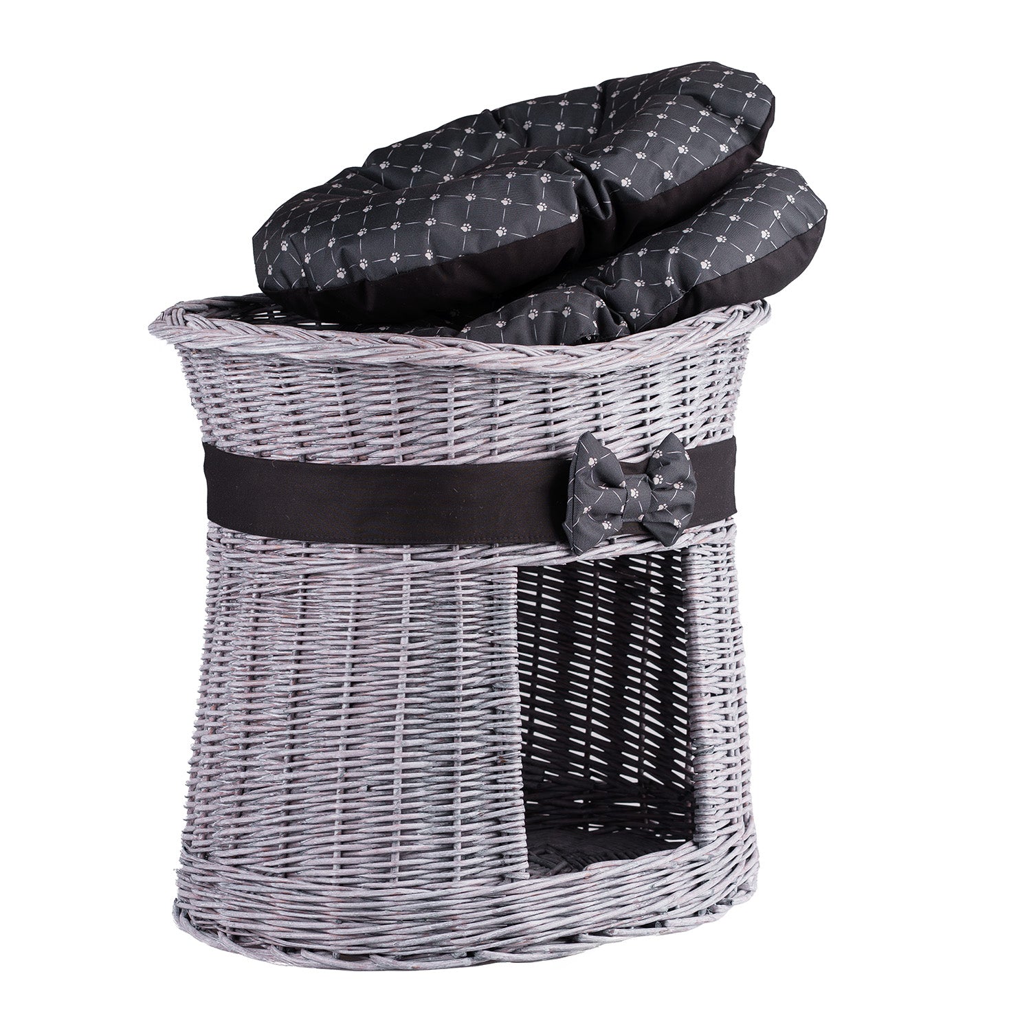Zachte kussens verhogen het ligcomfort en hun oppervlak is gemakkelijk te onderhouden – verfris ze regelmatig zodat het ligplekje hygiënisch blijft. De stabiele basis staat stevig op de vloer in de woonkamer, slaapkamer of hal, en de neutrale kleurstelling past uitstekend bij zowel moderne als klassieke interieurs. Afmetingen ca. 50 × 40 × 45 cm zijn geschikt voor kleinere en grotere ruimtes en de lichtheid van het wilgentenen maakt verplaatsen eenvoudig.