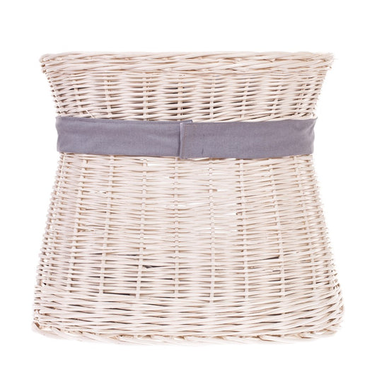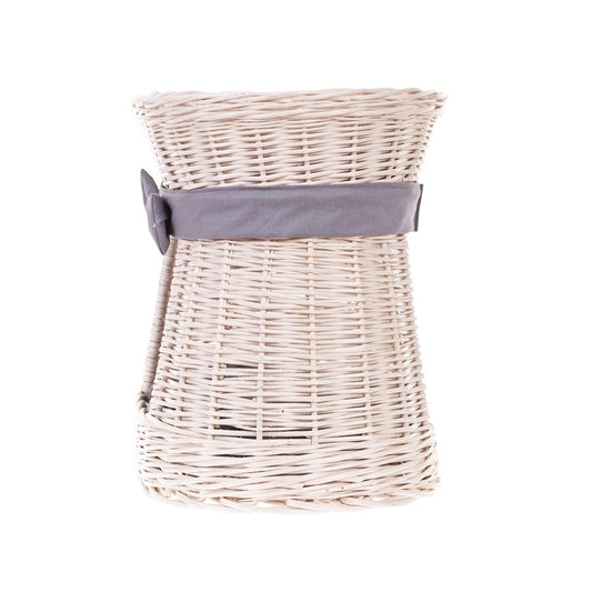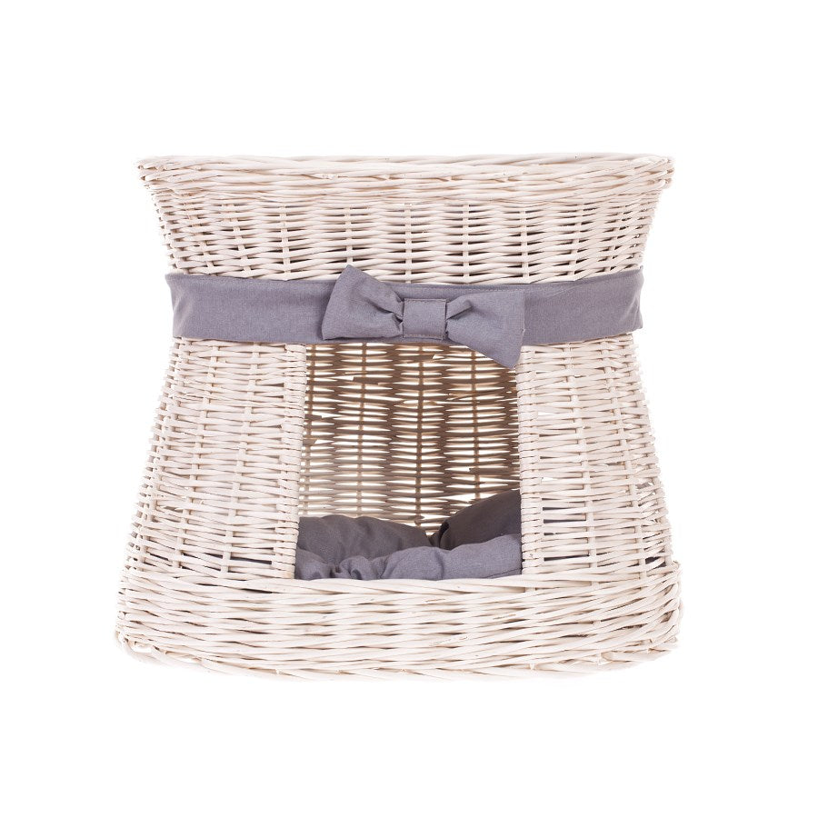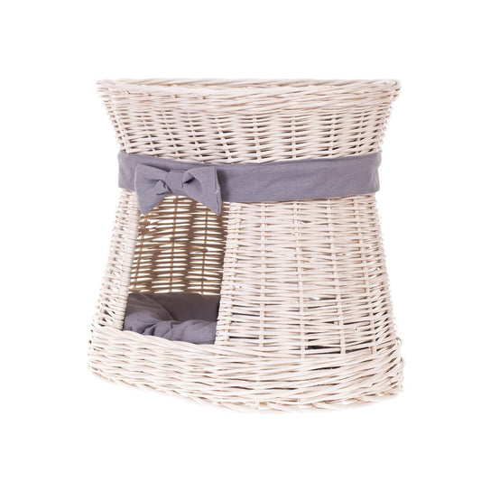 Een elegant, tweelaags kattenhuis van licht gevlochten wilgen straalt met zijn lichte, luchtige vorm. De ovale vorm met een brede, zorgvuldig gevlochten ingang aan de onderzijde creëert een knusse schuilplaats, terwijl het bovenste niveau dient als een comfortabel terras om te observeren. Het lichaam wordt bekroond met een decoratieve band van glad grijs textiel, gestrikt met een charmante strik die de meubellijn subtiel benadrukt. Beide verdiepingen worden aangevuld met zachte grijze kussens die perfect passen bij het interieur van de mand.