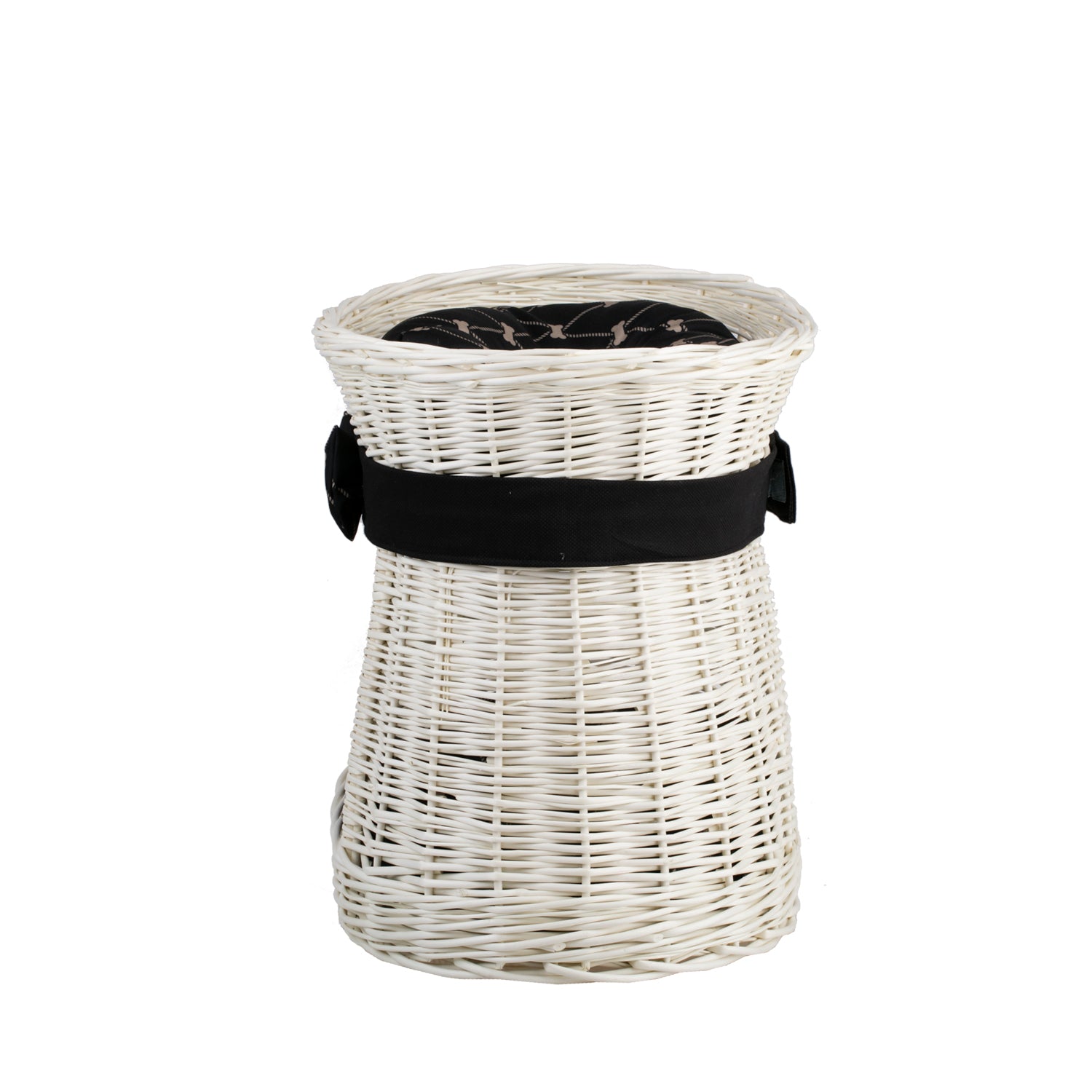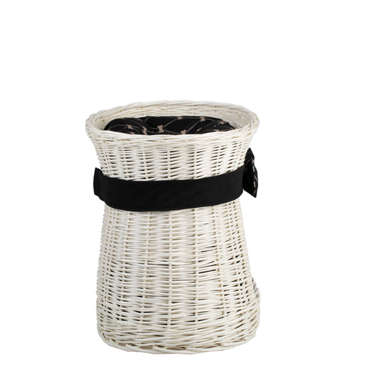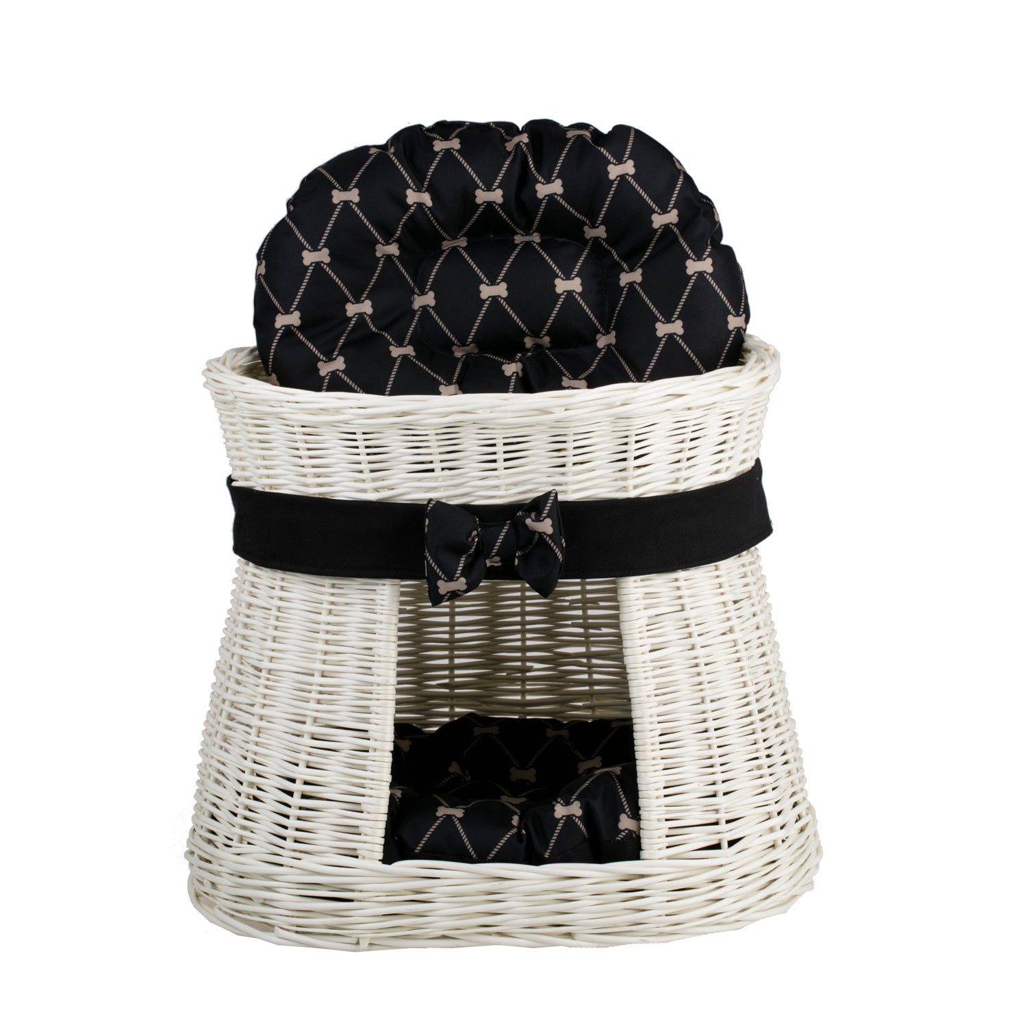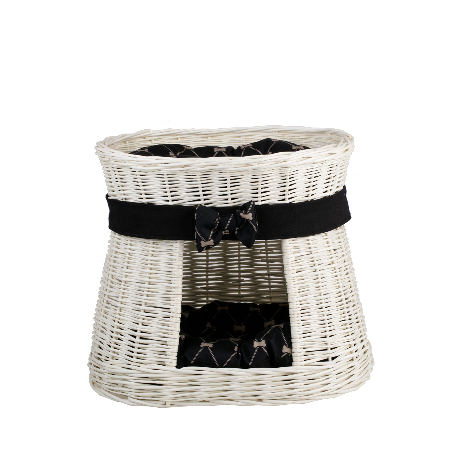 Hier is een elegante kattenmand van natuurlijk wilgenriet in een crèmekleurige tint. De tweelaagse constructie creëert onderin een knusse holte en bovenop een comfortabel terras om te ontspannen. Een gelijkmatige, dichte vlecht en afgeronde randen benadrukken de kwaliteit van de afwerking. Het geheel is versierd met een zwarte band met strik en twee zachte kussens in een bijpassend dessin.
