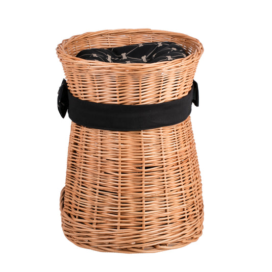 Een elegant kattenhuisje van natuurlijk wilgentenen valt op door het zorgvuldig vlechtwerk en de slanke, ovale uitstraling. De voorkant is voorzien van een brede opening naar het lagere schuilgedeelte, terwijl bovenop een comfortabel terras met een veilige rand zit. Het geheel wordt afgewerkt met een zwart lint met een decoratieve strik en twee zachte zwarte kussentjes passend voor beide niveaus. De onderzijde is iets verbreed, wat stabiliteit toevoegt en het vlechtpatroon fraai accentueert.
