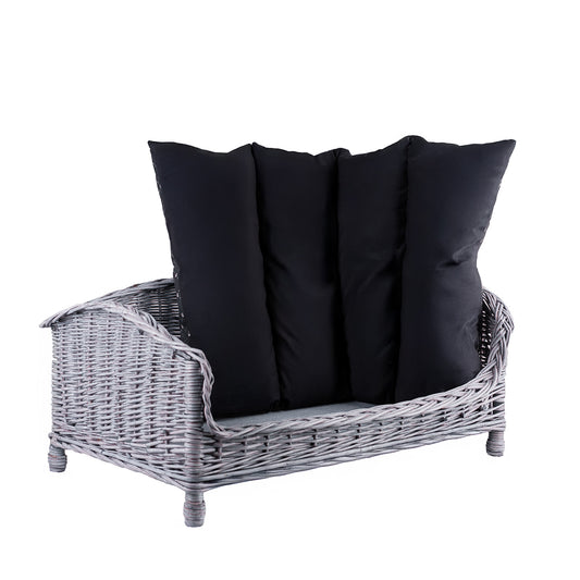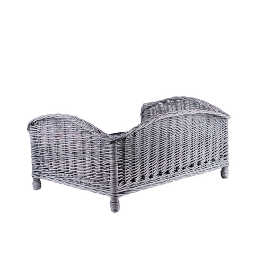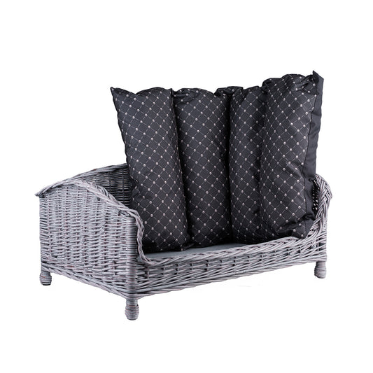 Een elegante riet- of rotanmand als huisdierbed die doet denken aan een mini-bankje. De gevlochten, grijze romp heeft hogere zijkanten en een zacht gebogen rugleuning, terwijl de voorkant verlaagd is voor gemakkelijke instap. Dichte vlecht met decoratieve randafwerking benadrukt het vakmanschap en de stabiele, afgeronde pootjes maken deel uit van de constructie. Inclusief zacht zwart kussen.