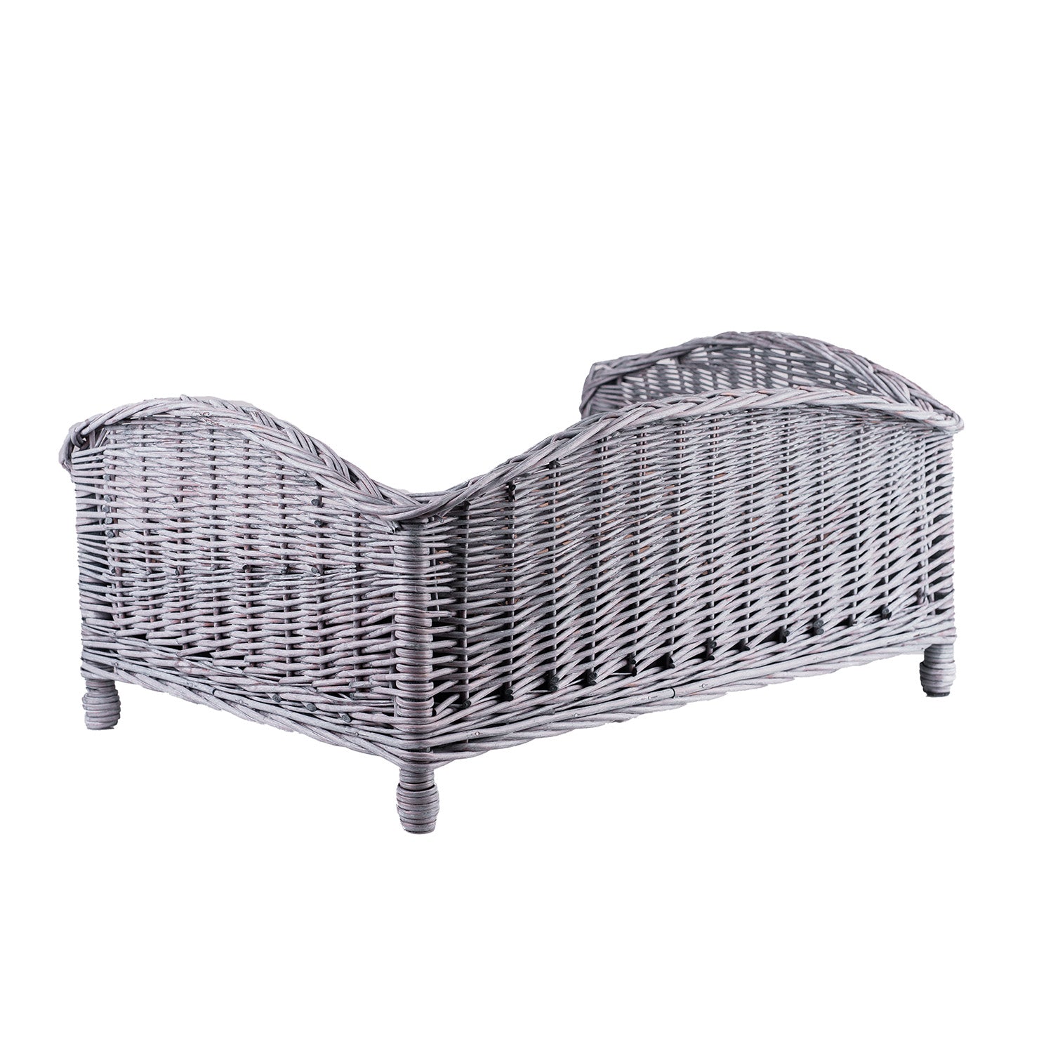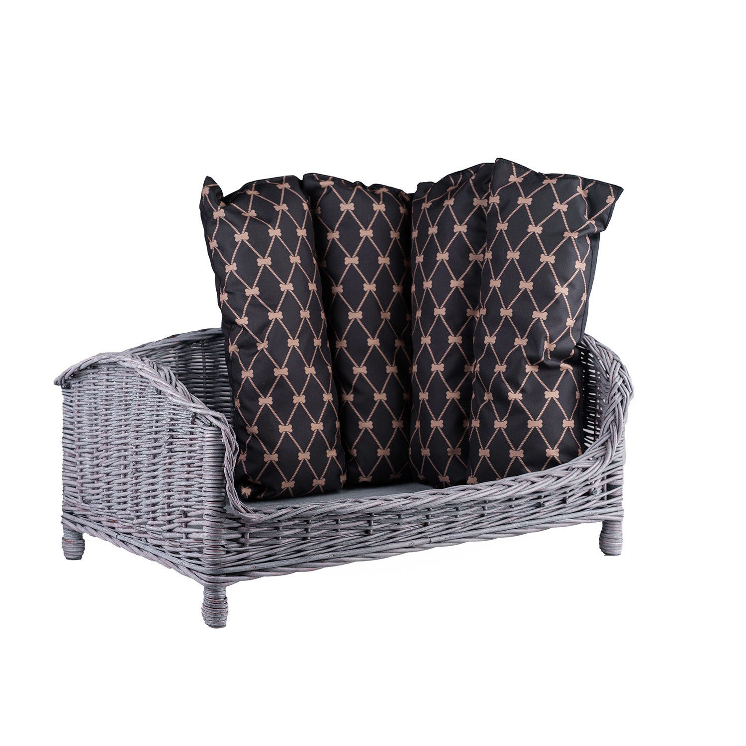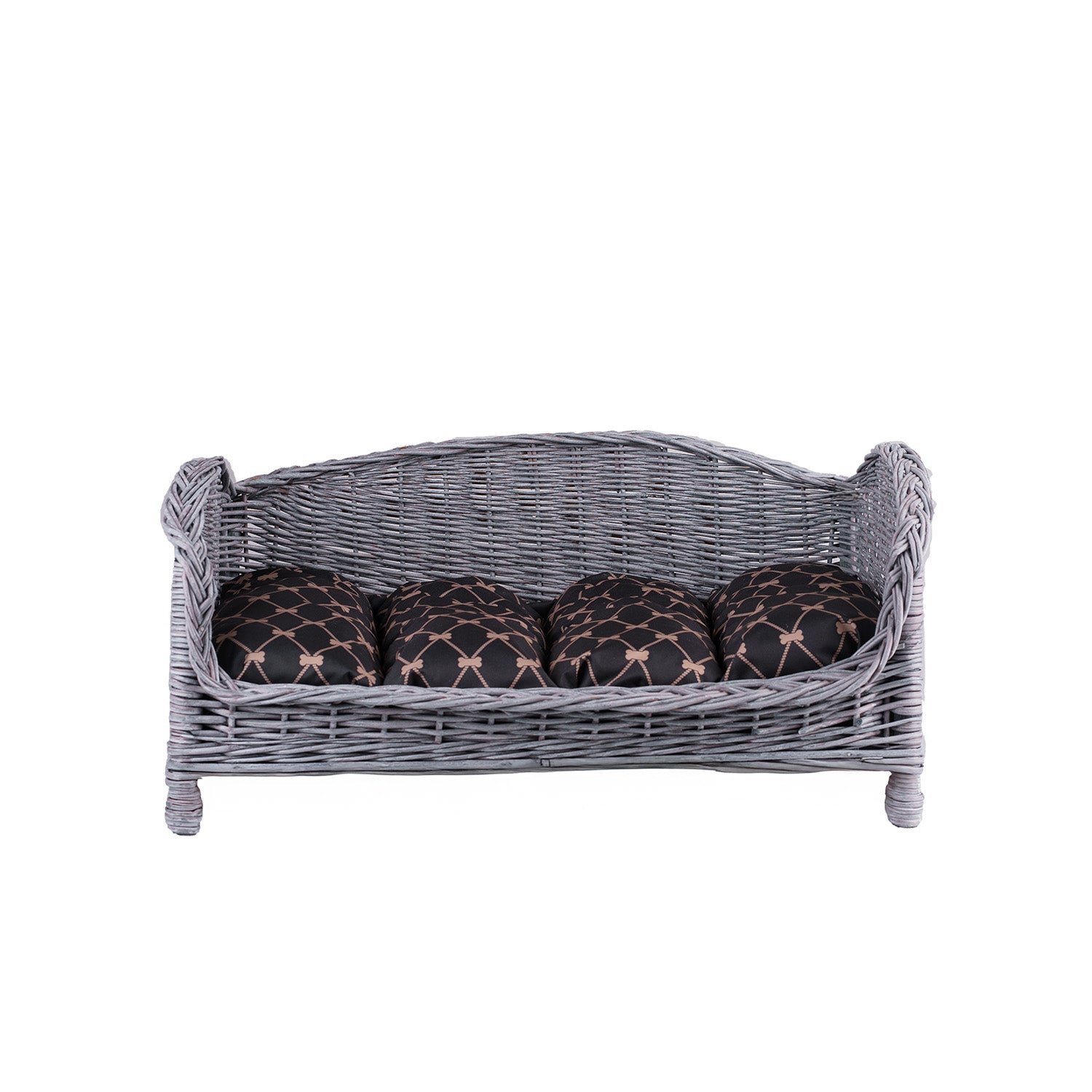Elegant gevlochten mandbed van wilgentenen voor hond en kat in de vorm van een kleine sofa: de verhoogde rugleuning en zijkanten omhullen uw huisdier, en de verlaagde voorkant maakt instappen gemakkelijk. Een dichte, gelijkmatige vlecht zorgt voor stabiliteit, afgeronde randen en gevlochten pootjes geven het geheel lichtheid. De mand is afgewerkt in een chique grijstint die harmonieus past in de woonkamer of slaapkamer. Bij het set hoort een zachte zwarte kussen die een knusse slaap- en dutplek creëert.