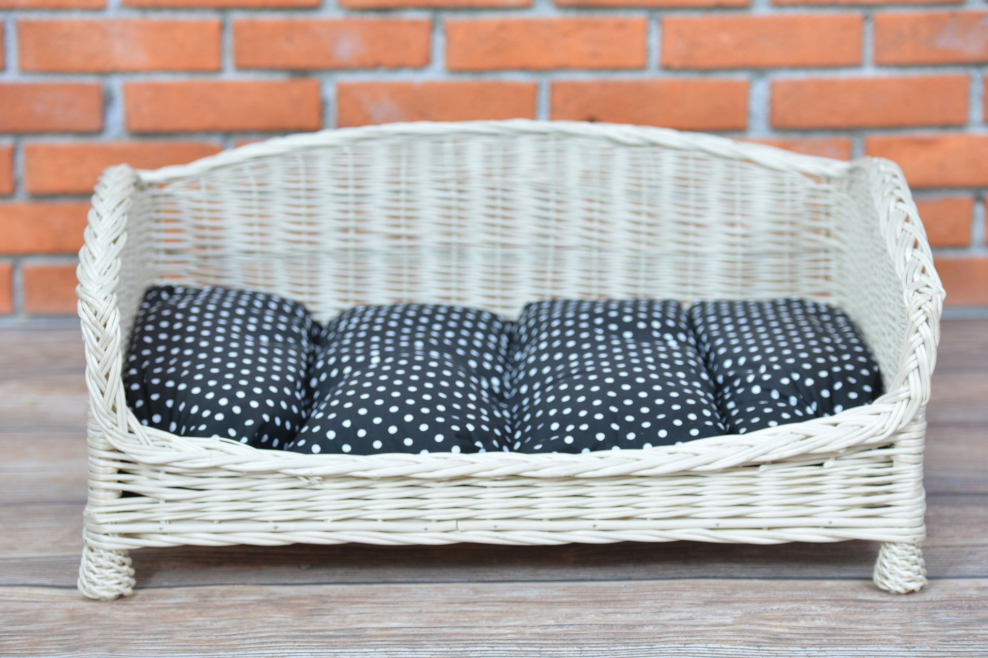 Een elegant ligmandje van natuurlijk wilgentenen heeft een subtiele crèmekleur en een dicht, gelijkmatig vlechtwerk. De voorkant met verlaagd instap vergemakkelijkt de toegang, en hogere zijkanten en achterzijde vormen een knusse rugleuning. De rand is afgewerkt met zorgvuldig vlechtwerk. Binnenin ligt een zachte, doorgestikte kussen. Het geheel oogt licht en netjes.