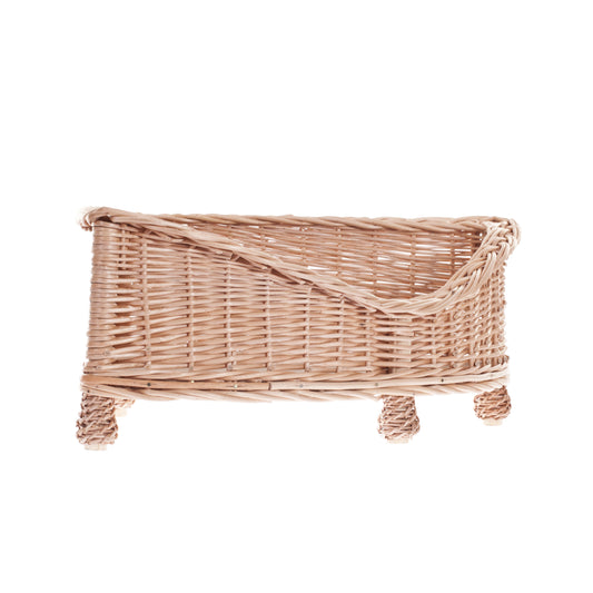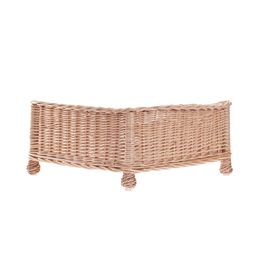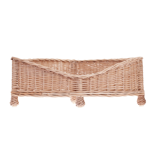 Een elegant honden- of kattenmandje van wilg creëert een knusse, veilige rustplaats voor je huisdier. Het vlechtwerk is gelijkmatig en dicht, en de bovenrand is afgewerkt met een decoratieve vlecht die de constructie versterkt. De verlaagde instap maakt het in- en uitstappen eenvoudig, terwijl hogere zijkanten en de achterkant een beschut gevoel geven. Een stabiele, platte basis en gevlochten pootjes houden het geheel van de vloer.