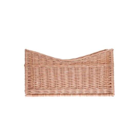 De mand is net zo praktisch buiten het stookseizoen. Hij biedt plaats aan dekens en kussens in de woonkamer, dient als speelgoedmand in de kinderkamer of als organizer voor kranten en accessoires in de hal. In de tuin is hij handig voor het verzamelen van lichte oogsten. Afmetingen ca. 63 × 43 cm, zijhoogtes 33/26/33 cm. Reinigen: water met een mild schoonmaakmiddel en een zachte borstel, droog daarna goed af.