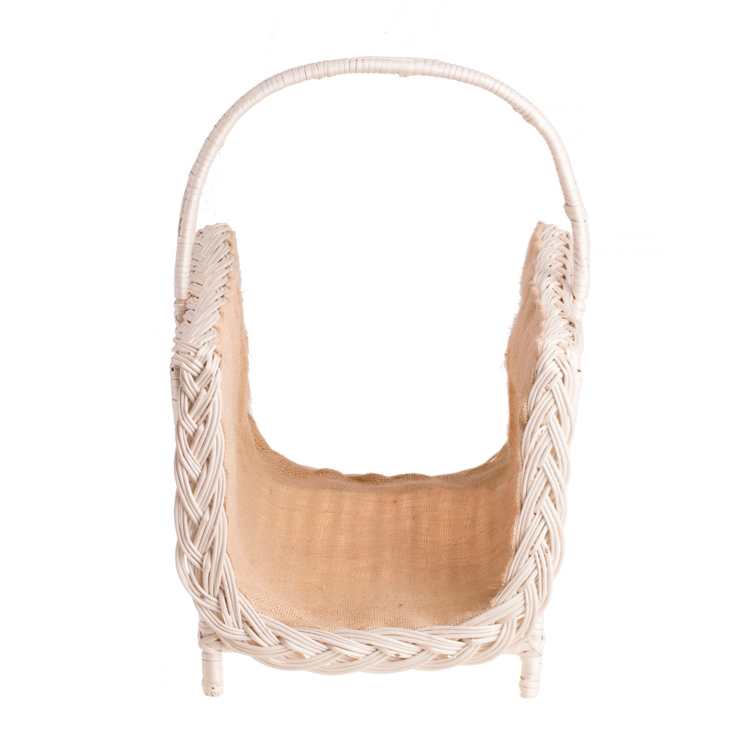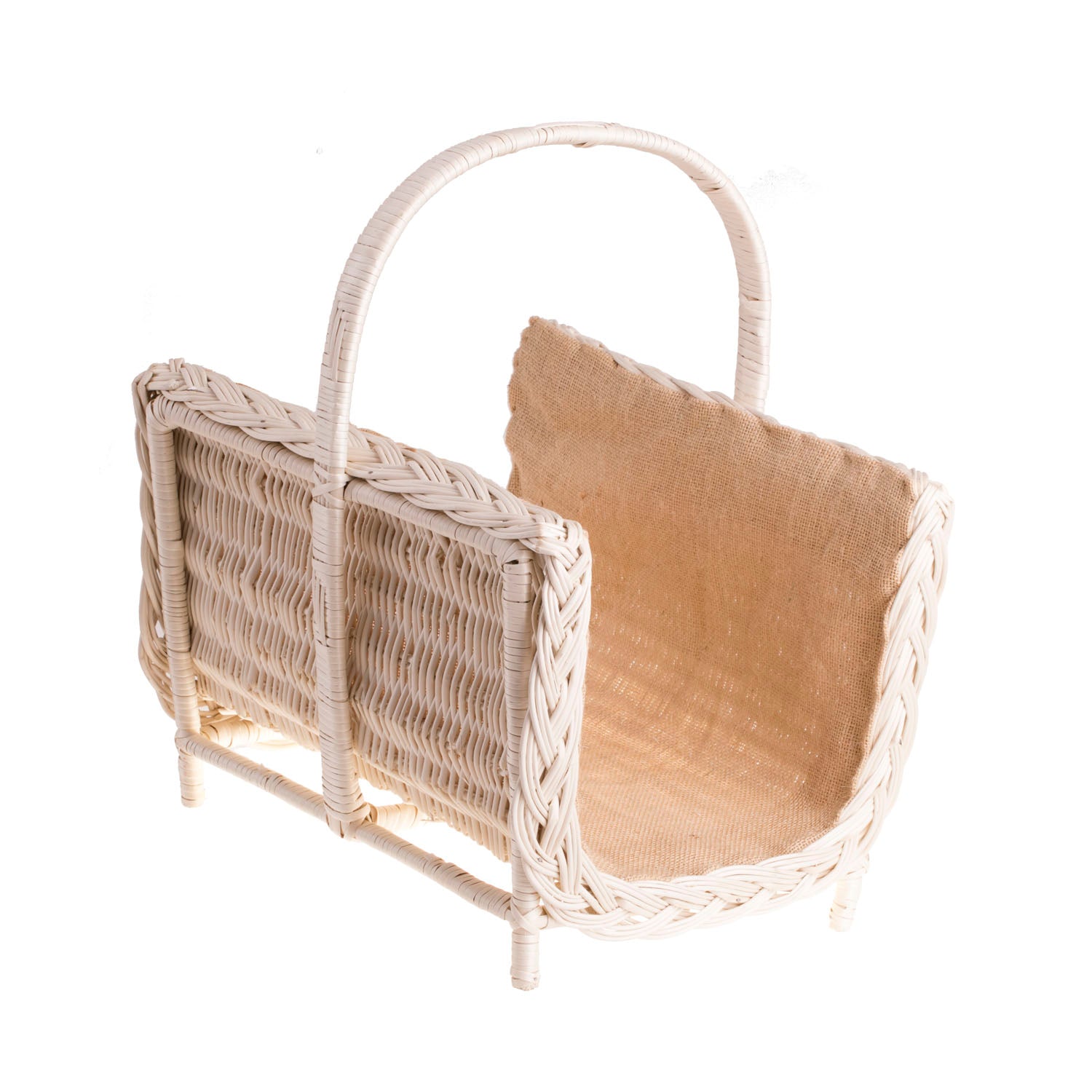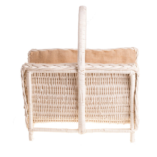 Een elegante haardmand van licht riet valt op door zijn crèmekleurige tint en verzorgde details. De zijkanten zijn dicht gevlochten met een decoratieve vlecht langs de randen en het geheel staat op stabiele pootjes. Een handig handvat in het midden maakt éénhandig dragen eenvoudig. De binnenkant aan de rugzijde is gevoerd met natuurlijke jute om kleine splinters op te vangen en de haardomgeving netjes te houden.