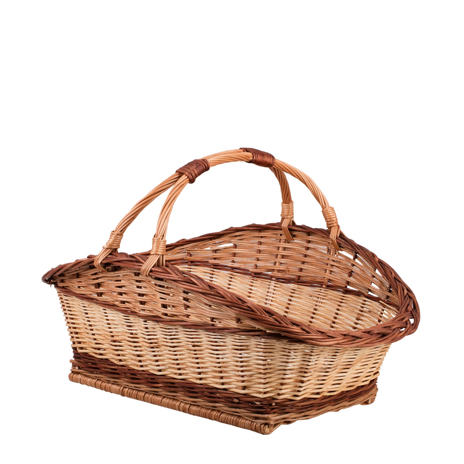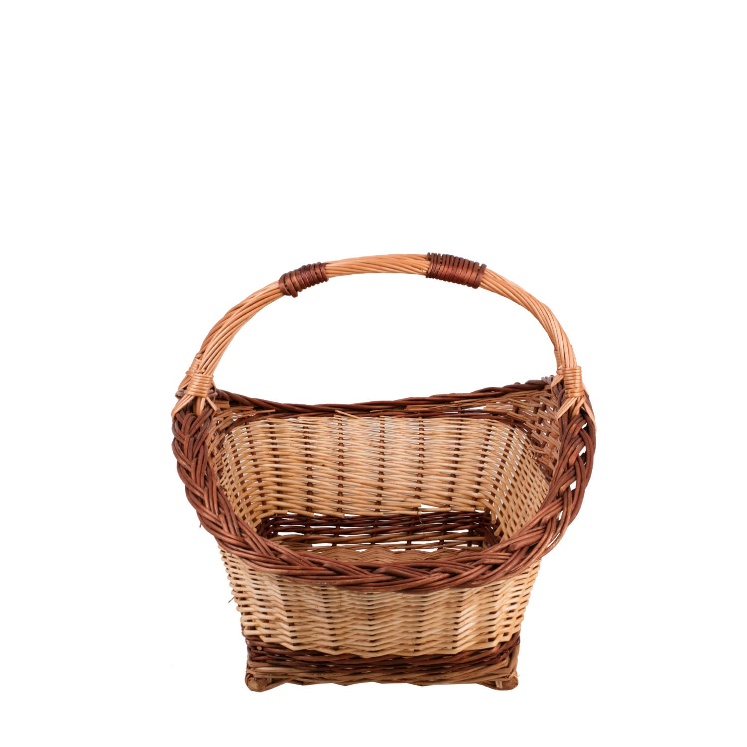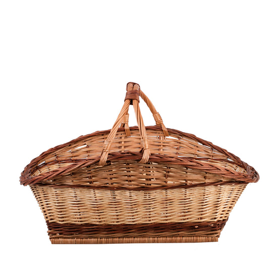 Een rechthoekige haardmand voor brandhout met een brede bodem en elegant opstaande zijkanten trekt de aandacht met zijn klassieke vorm. Boven het lichaam rijst een gevormde, dubbele handgreep op, stevig gevlochten en veilig in de hand. De rand afgewerkt met een vlecht en een versterkte onderlat zorgen voor stabiliteit. Een tweekleurige rotanvlecht creëert subtiele, decoratieve strepen die warmte van de natuur in het interieur brengen.