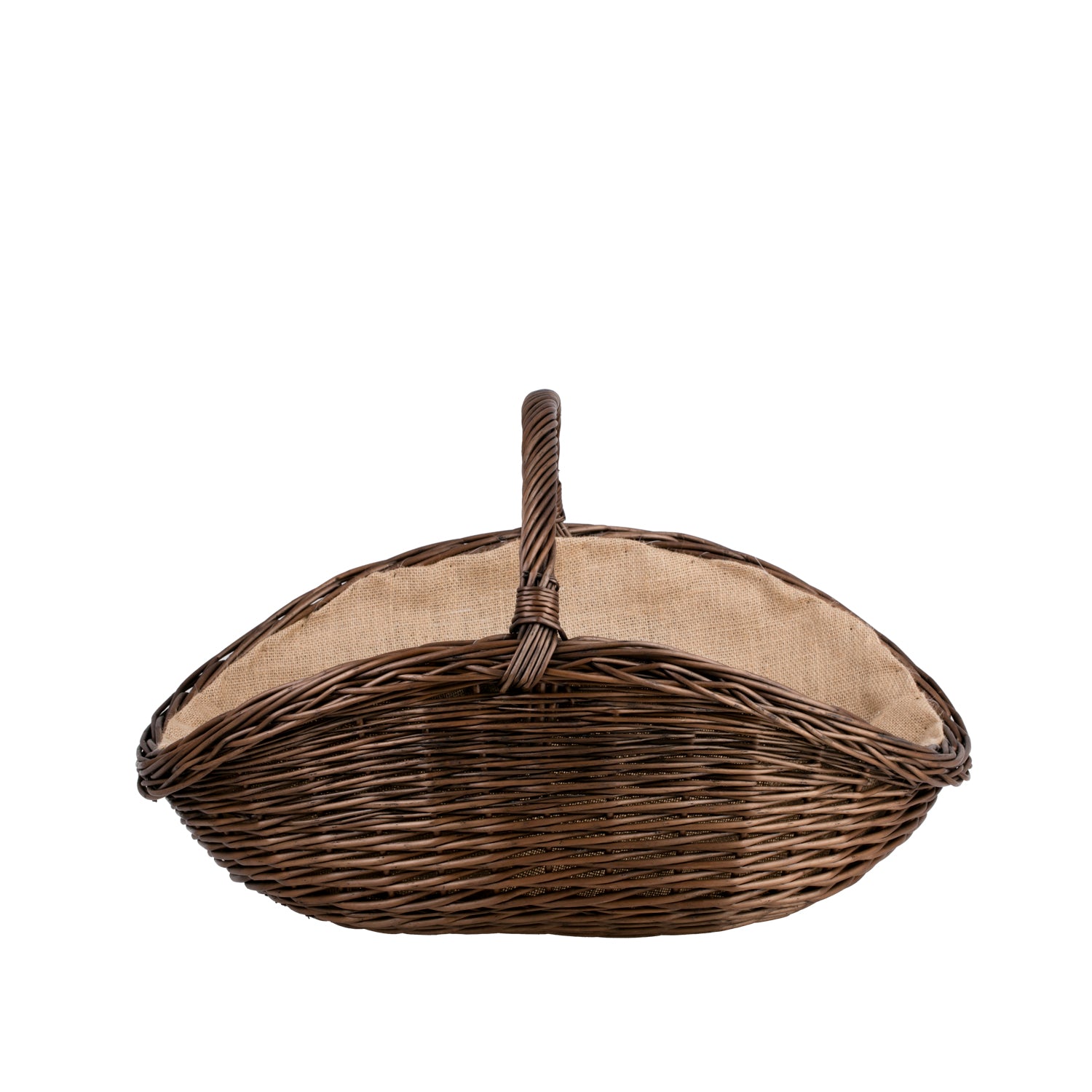 Elegante haardmand van natuurlijk riet die indruk maakt met zijn diepe, donkerbruine tint. Gespiegeld gevormde zijkanten en het brede, boogvormige handvat geven hem een lichte uitstraling en zorgen tegelijk voor een stevige grip tijdens het dragen. Binnenin is een praktische jutebevestiging in natuurlijk beige aangebracht, die subtiel contrasteert met de kleur van het vlechtwerk. Een gelijkmatige vlecht, zorgvuldig afgezette randen en een stabiele bodem bevestigen de hoge kwaliteit; als natuurproduct kan het kleine kleurverschillen hebben.