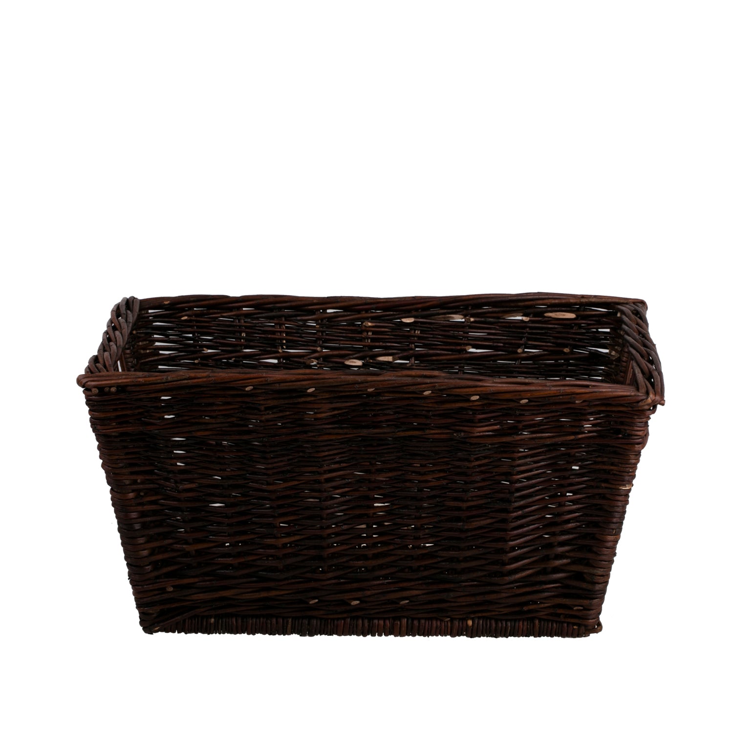 Dit is een wilgenmand voor haardhout die de aandacht trekt met een elegante donkerbruine afwerking en een natuurlijke glans. De strakke lijnen en de dichte, golvende vlecht met zichtbare schors benadrukken de authenticiteit van het materiaal. Een verstevigde rand verhoogt de stabiliteit en geïntegreerde, stevige handvatten maken het gemakkelijk om de mand op te tillen en bij de haard te plaatsen. De mand is een decoratief accent in de woonkamer.