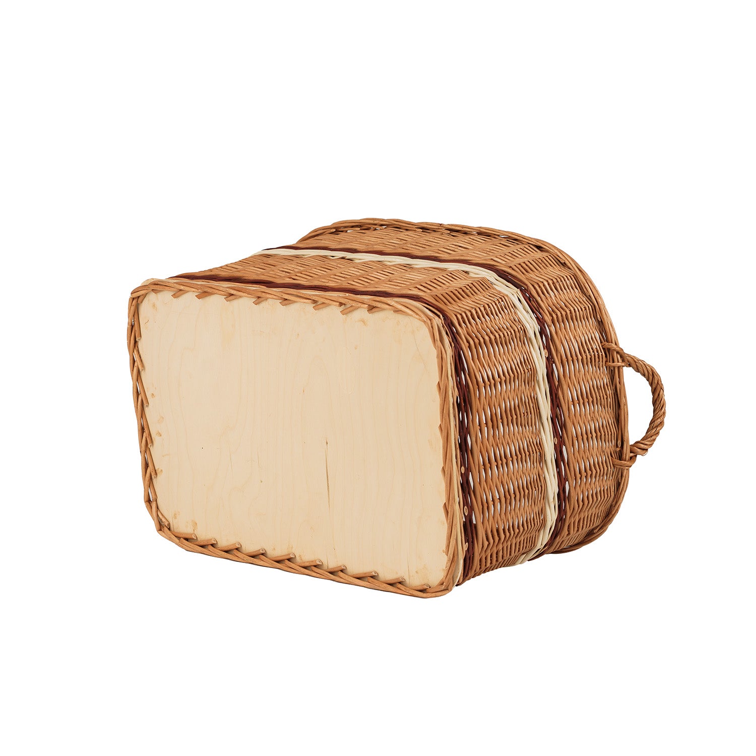 Een rechthoekige mand van volle wilgentenen combineert eenvoud en stevigheid. Hoge, gelijkmatig gevlochten wanden en een stabiele bodem creëren een ruime binnenkant voor haardhout. Twee sterke oogruggrepen, gedraaid van dikke rietstengels, zorgen voor een veilige greep. Decoratieve banden in lichtere en donkerdere tinten benadrukken het ambachtelijke karakter en de gladde rand ziet er mooi uit.