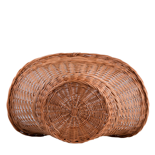 De met de hand gevlochten rieten mand voor de open haard valt op door de natuurlijke, warme honingkleur van het riet en de zorgvuldige afwerking. Hij heeft brede, zacht uitwaaierende zijden, een ovale vorm en een comfortabele, centraal geplaatste handgreep omwikkeld met stevige vlecht. De dichte vlecht en de verstevigde rand zorgen voor stabiliteit en de gladde randen beschermen de handen. De subtiele glans van de natuurlijke kleur benadrukt het ambachtelijke werk in elk detail.