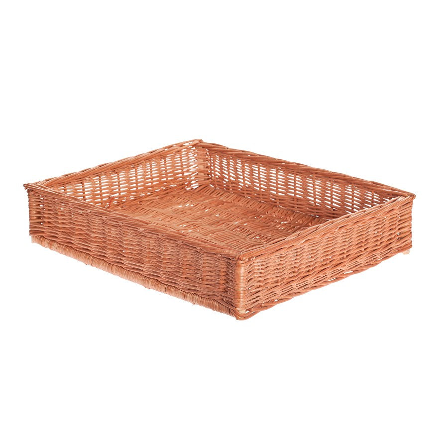 Een rechthoekige presentatiekorf met lage zijkanten toont de natuurlijke schoonheid van riet in een warme, honingkleurige tint. Zorgvuldig gevlochten zijkanten vormen stabiele, gelijkmatige randen met een verstevigde rand, en de dichte bodemvlechting biedt betrouwbare ondersteuning voor producten. De afwerking is glad en esthetisch, waardoor de korf professioneel oogt op de toonbank. Het model is volledig open – zonder handvatten, deksel of bies – en biedt snelle toegang tot de inhoud.