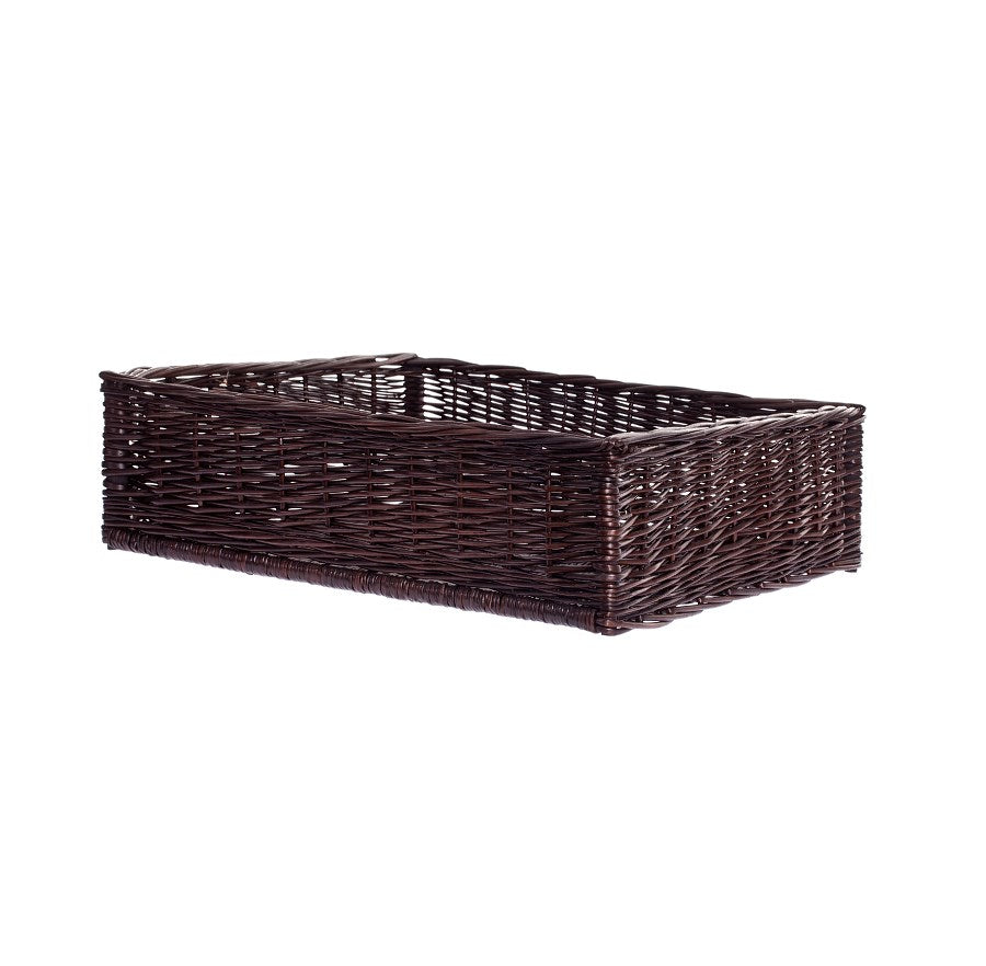 De rechthoekige presentatiemand van natuurlijk wilgengeflecht valt op door een diepe, donkerbruine wengékleur die de getoonde producten elegant benadrukt. Lage wanden van circa 12 cm bieden gemakkelijke toegang tot de inhoud en de zorgvuldig afgewerkte rand verstevigt het geheel. Dichtere vlecht aan de randen en licht ajour aan de zijkanten creëren een luchtige vorm zonder handgrepen of bies. De subtiele glans van de vezels en extra omvlechting langs de randen verhogen de esthetiek en duurzaamheid.