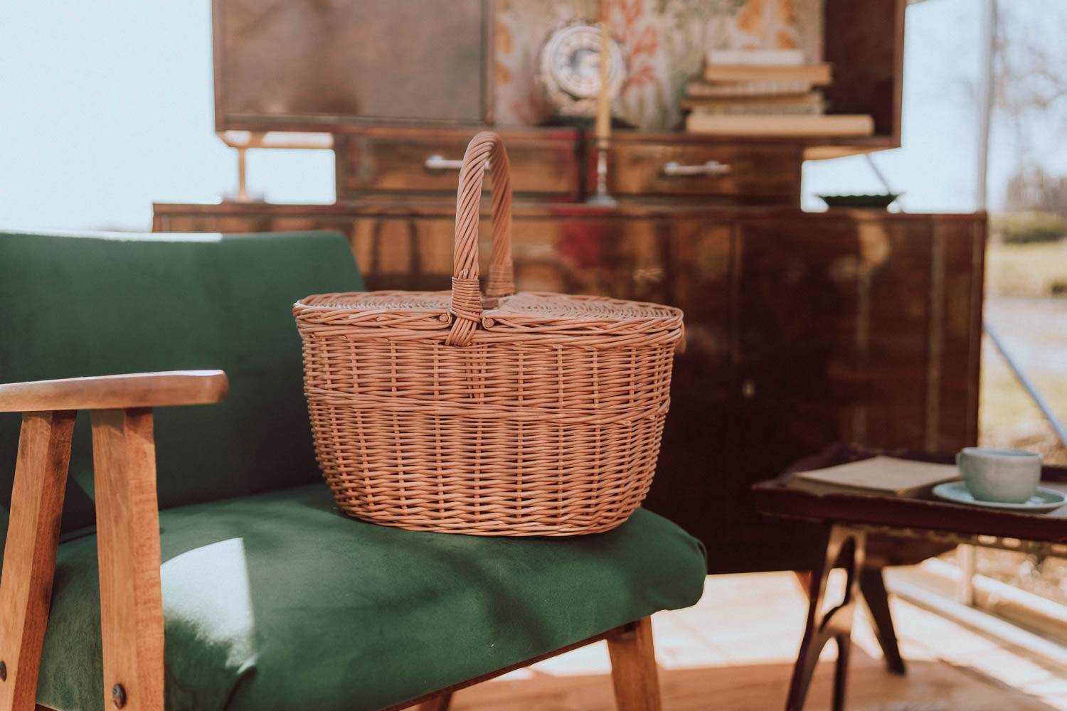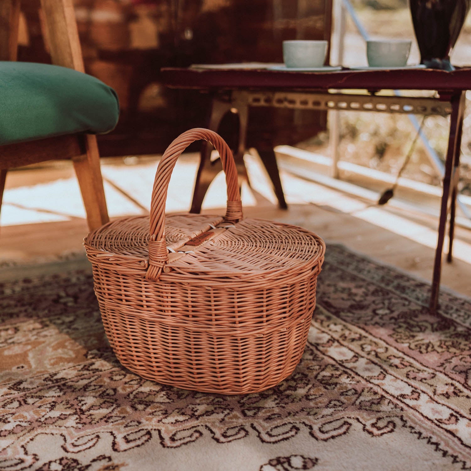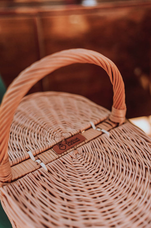De klassieke rieten picnicmand valt op door zijn nauwkeurige vlechtwerk en een zuivere, natuurlijke afwerking. Hij heeft een comfortabel gebogen handvat en een nauwsluitend deksel dat de inhoud beschermt. Een donkerder vlechtstrook langs de rand en aan de basis geeft elegantie, en gladde randen en een gelijkmatig vlechtpatroon zorgen voor een fraaie uitstraling buiten en binnen. Afgewerkt met een versterkte rand die de duurzaamheid verhoogt.