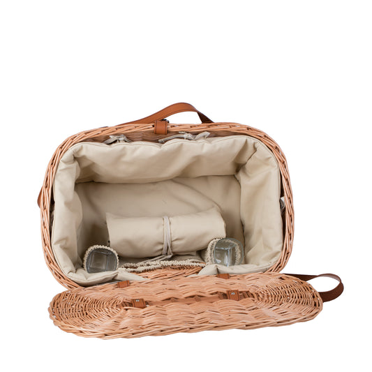 Ontworpen voor picknicks, uitstapjes en lange wandelingen. Het stijve deksel beschermt etenswaren effectief tegen stof en insecten, en de lange leren banden maken het eenvoudig om ook zwaardere sets te dragen. Binnenin een praktische katoenen voering met vakken voor glaswerk om bekers en kleine items georganiseerd te houden. Het meegeleverde ronde rieten dienblad vergemakkelijkt het serveren en het scheiden van delicate producten, borden of brood.